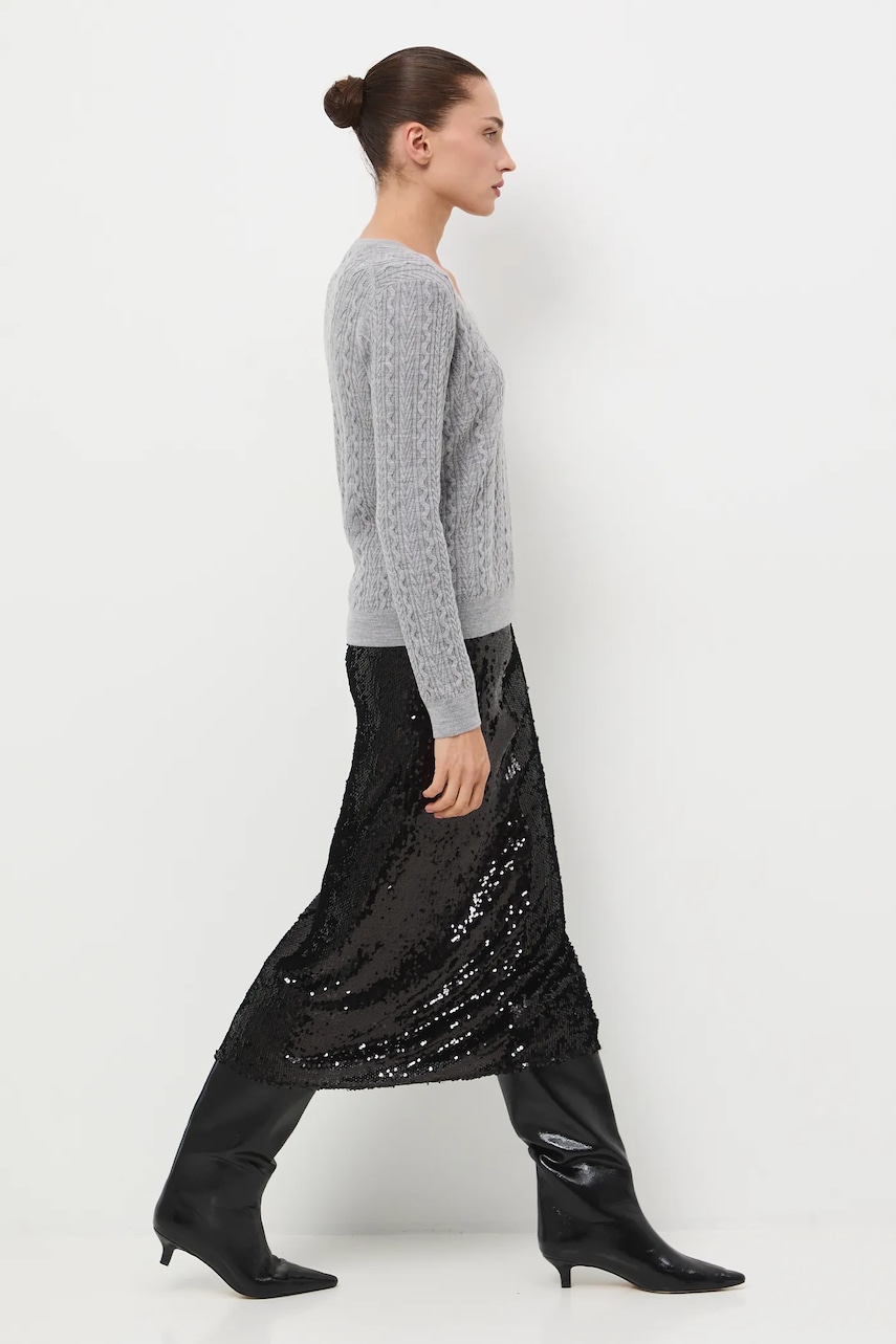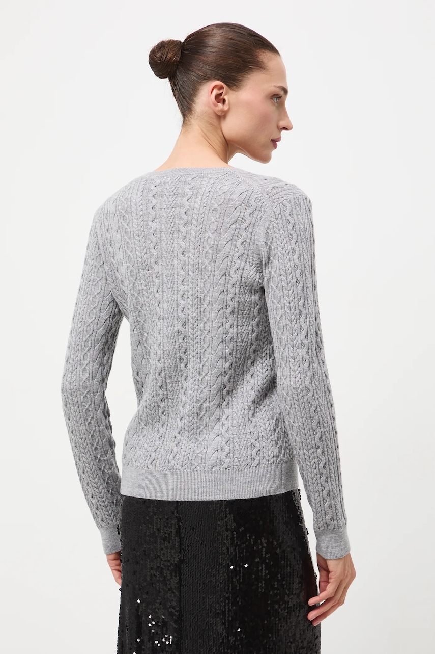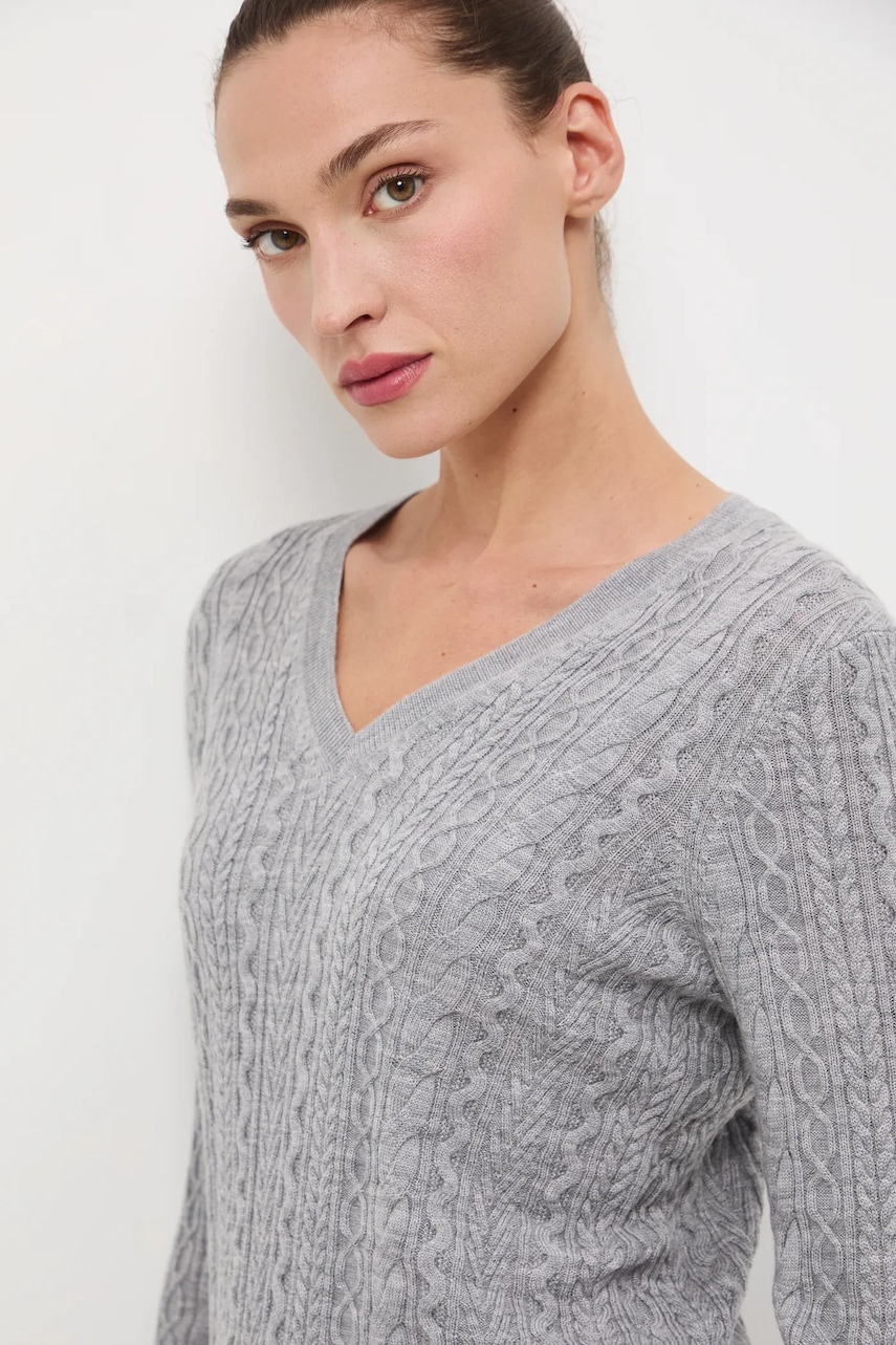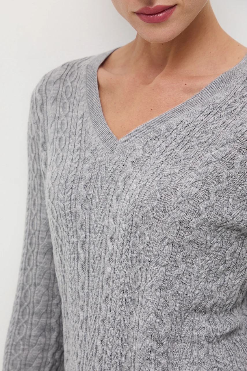 - Sweter wykonany w 100% z wełny merino. - Sweter w fasonie regular zapewnia wygodę i uniwersalny wygląd. Delikatnie dopasowuje się do sylwetki, ale nie podkreśla jej nadmiernie. Klasyczny i prosty, sprawdzi się zarówno w eleganckich, jak i casualowych stylizacjach. - Długi rękaw. - Spiczasty dekolt. - Wykończenie ze ściągacza. - Warkoczowy splot. - Melanżowa dzianina. - Długość rękawa: 59 cm. - Długość: 57 cm. - Szerokość w biuście: 45 cm. - Wymiary podane dla rozmiaru: S.