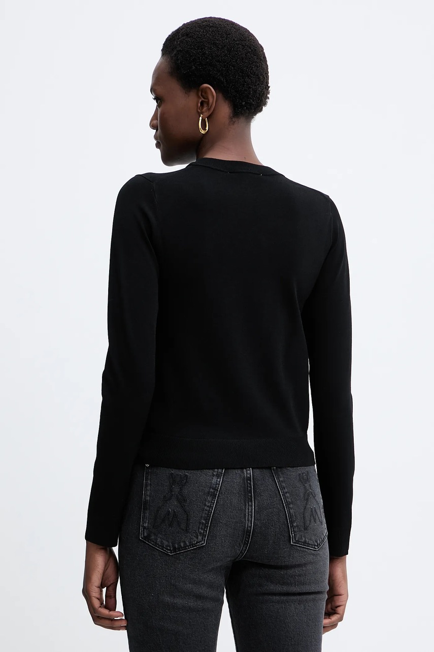 - Ten produkt został częściowo uszyty z wiskozy pochodzącej z recyklingu. - Prosty, nie blokujący ruchów fason. - Długi rękaw. - Klasyczny, okrągły dekolt. - Rękawy i dolna krawędź wykończone wygodnym, elastycznym ściągaczem. - Długość rękawa: 61 cm. - Długość: 51 cm. - Szerokość pod pachami: 41 cm. - Wymiary podane dla rozmiaru: S.
