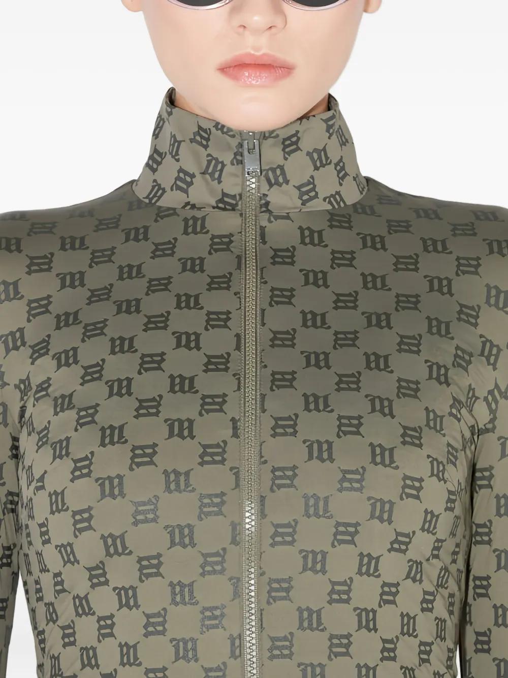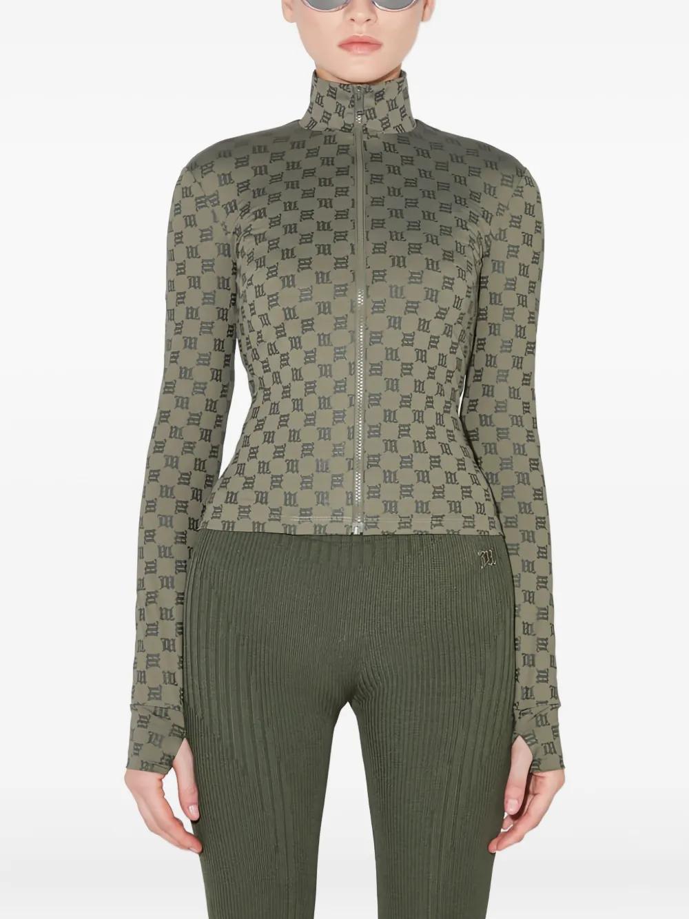 olive monogram pattern stand collar thumbholes zip fastening long sleeves