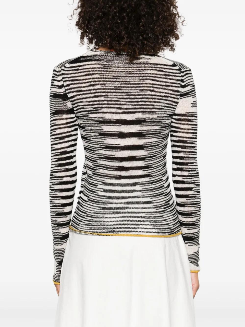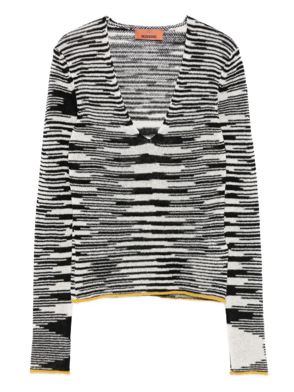 black and white yellow trim V-neck long sleeves horizontal stripe pattern The item you receive may differ slightly from the item photographed. This is due to the artisanal nature with which all Missoni products are constructed.