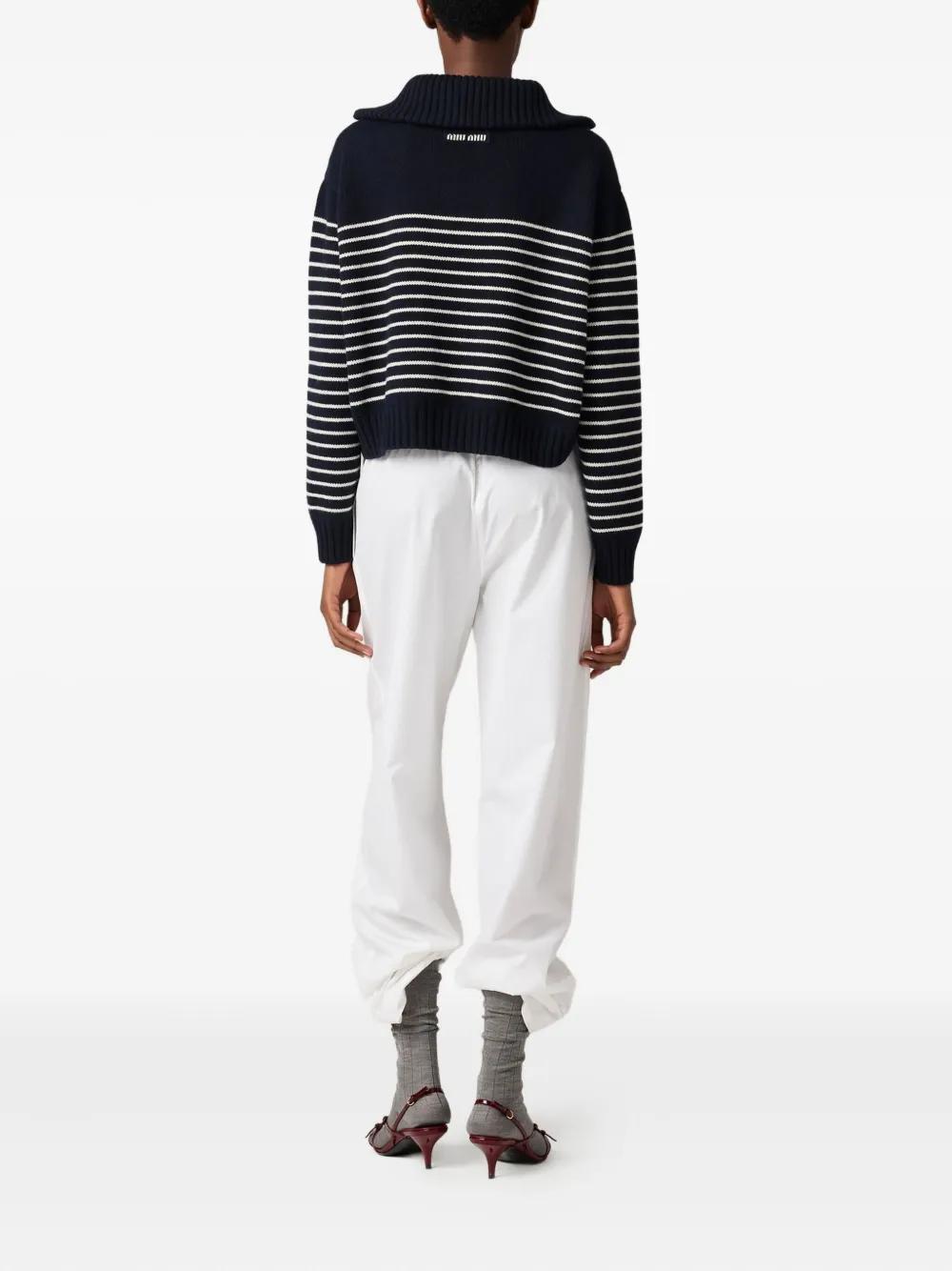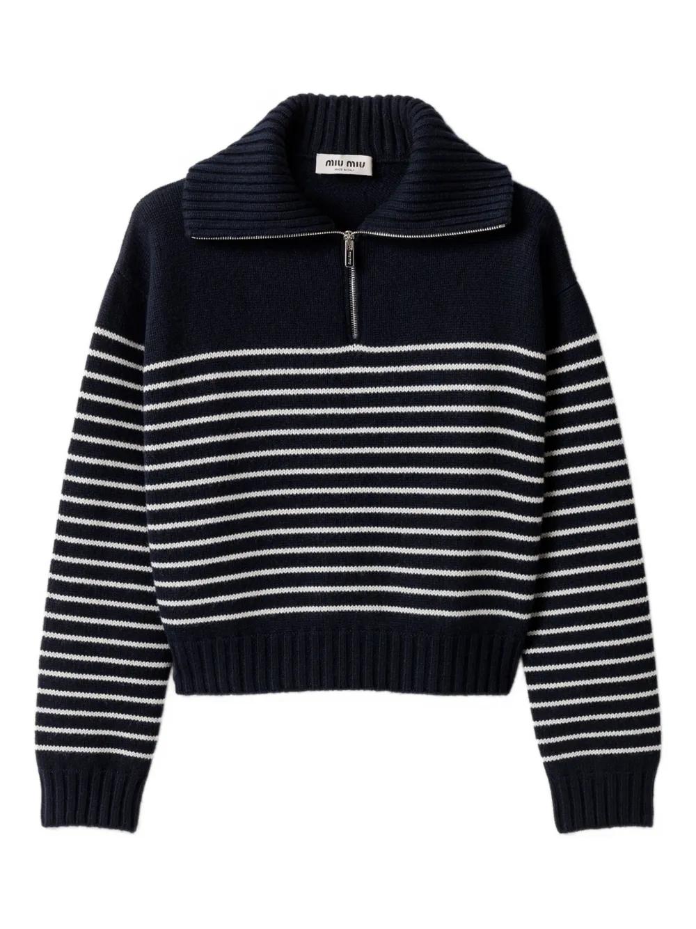 navy blue cashmere ribbed collar striped pattern long sleeves front zip closure