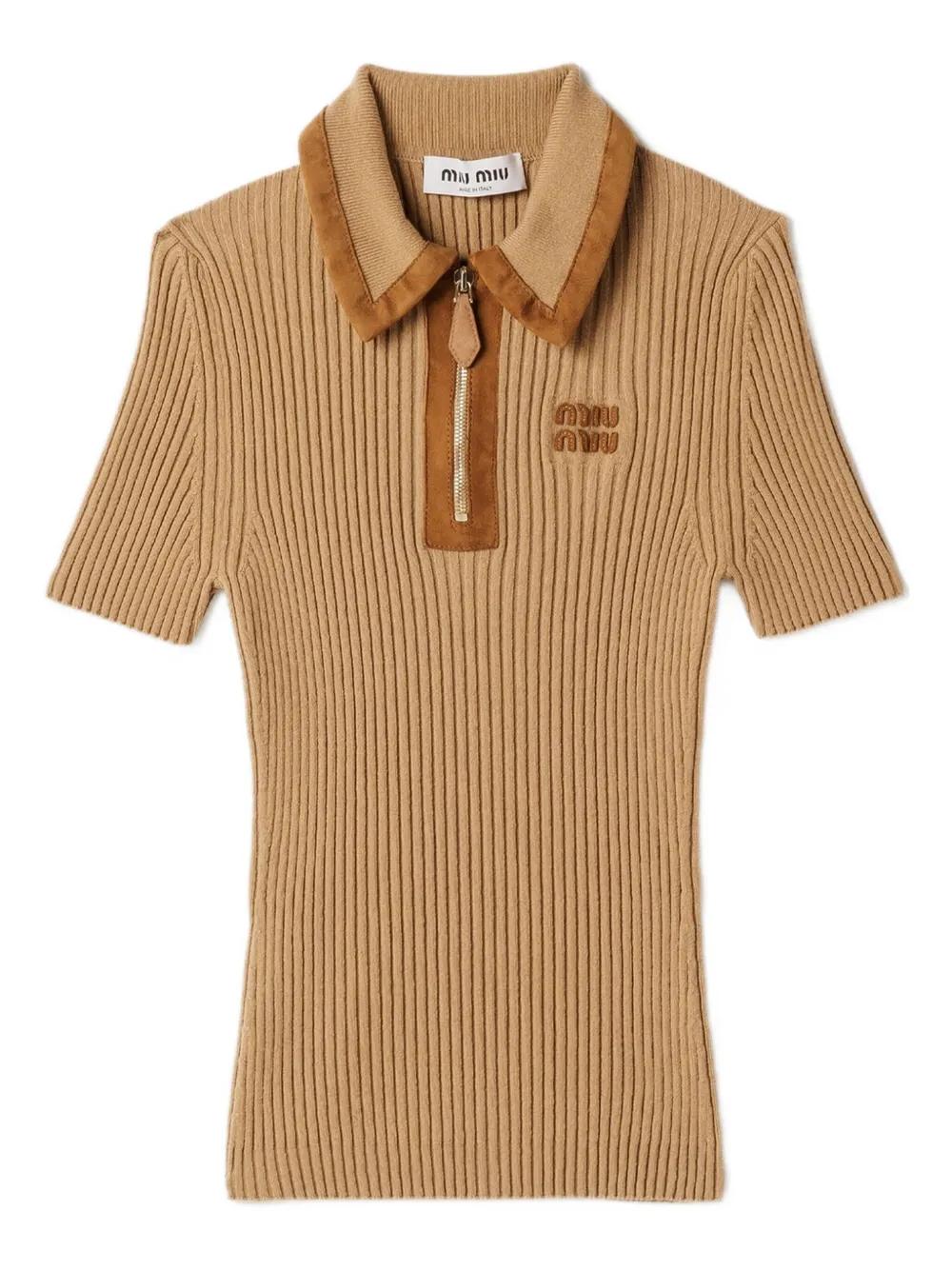 brown ribbed knit trim detail short sleeves front zip embroidered logo