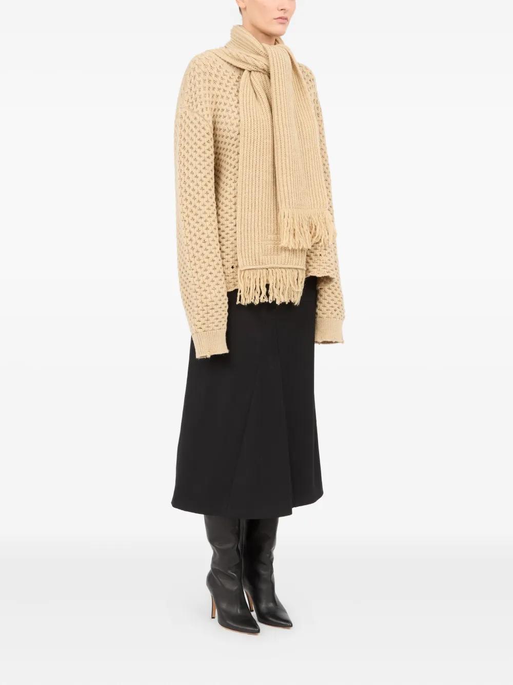 beige quilted knit design attached scarf fringe detailing ribbed cuffs