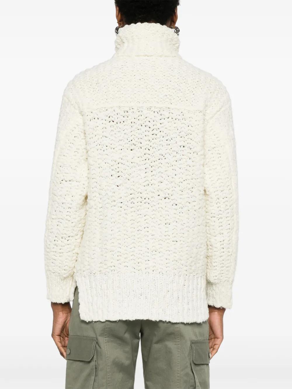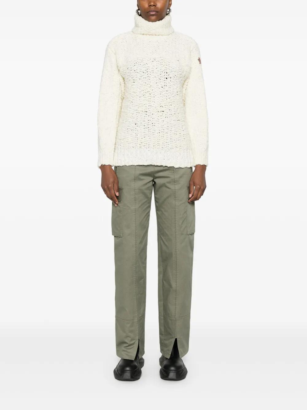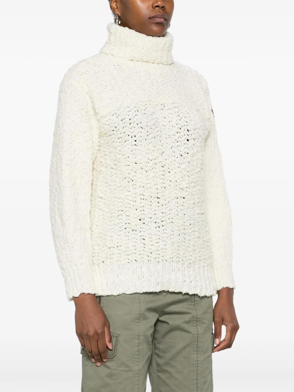 cream white virgin wool blend chunky knit polo neck long sleeves logo patch at the sleeve ribbed cuffs short side slits ribbed high-low hem