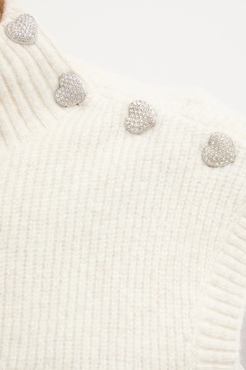 - Ten produkt został częściowo uszyty z poliestru pochodzącego z recyklingu. - Prosty, nie blokujący ruchów fason. - Model z półgolfem. - Materiał z metaliczną nicią. - Zapięcie na ozdobne guziki. - Długość: 58 cm. - Szerokość pod pachami: 50 cm. - Wymiary podane dla rozmiaru: S.