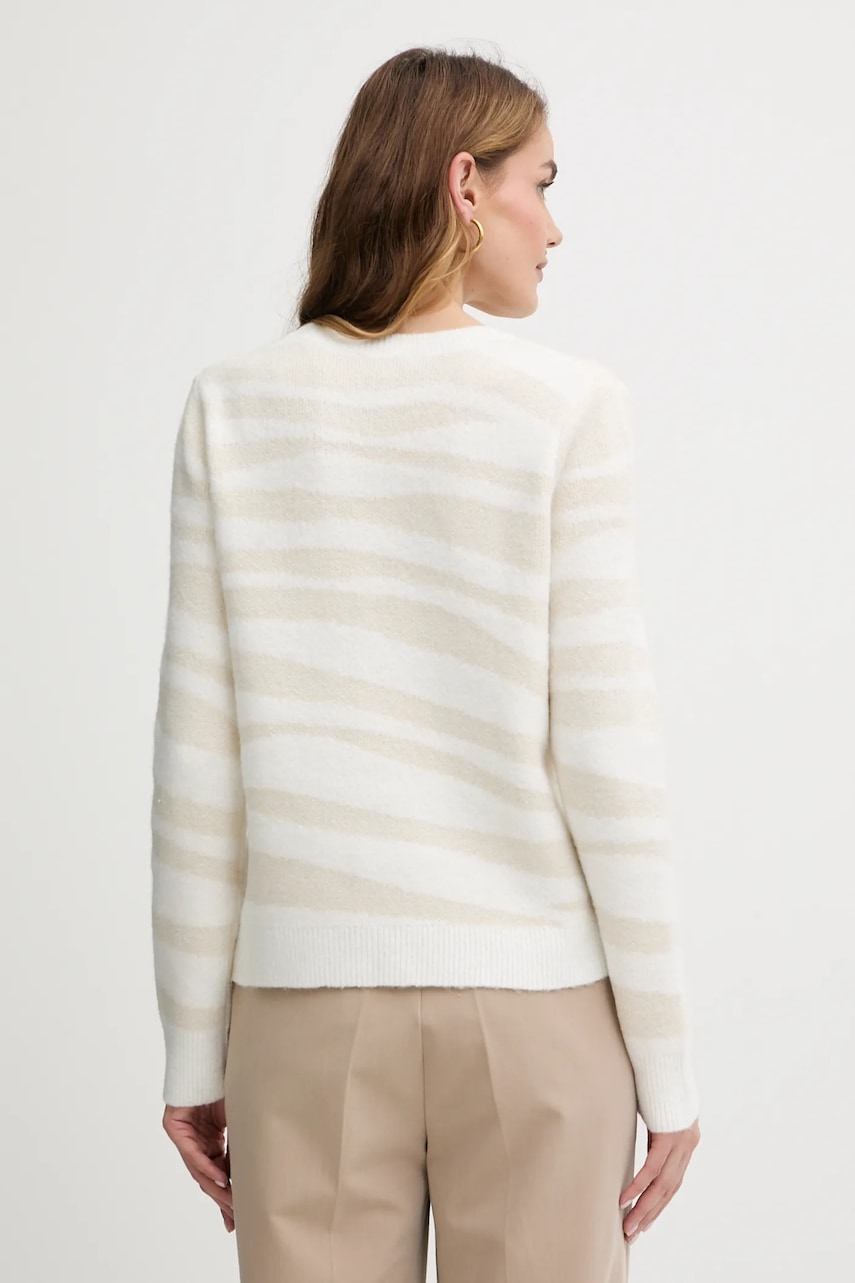 - Sweter w fasonie regular zapewnia wygodę i uniwersalny wygląd. Delikatnie dopasowuje się do sylwetki, ale nie podkreśla jej nadmiernie. Klasyczny i prosty, sprawdzi się zarówno w eleganckich, jak i casualowych stylizacjach. - Klasyczny, okrągły dekolt. - Długi rękaw. - Rękawy i dolna krawędź wykończona wygodnym, elastycznym ściągaczem. - Wzór w pasy. - Materiał z metaliczną nicią. - Elastyczna dzianina o średniej grubości. - Długość rękawa: 74 cm. - Długość: 61 cm. - Szerokość pod pachami: 46 cm. - Wymiary podane dla rozmiaru: S.