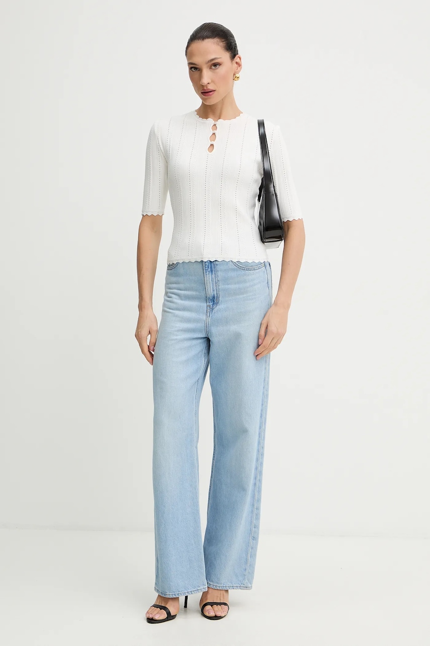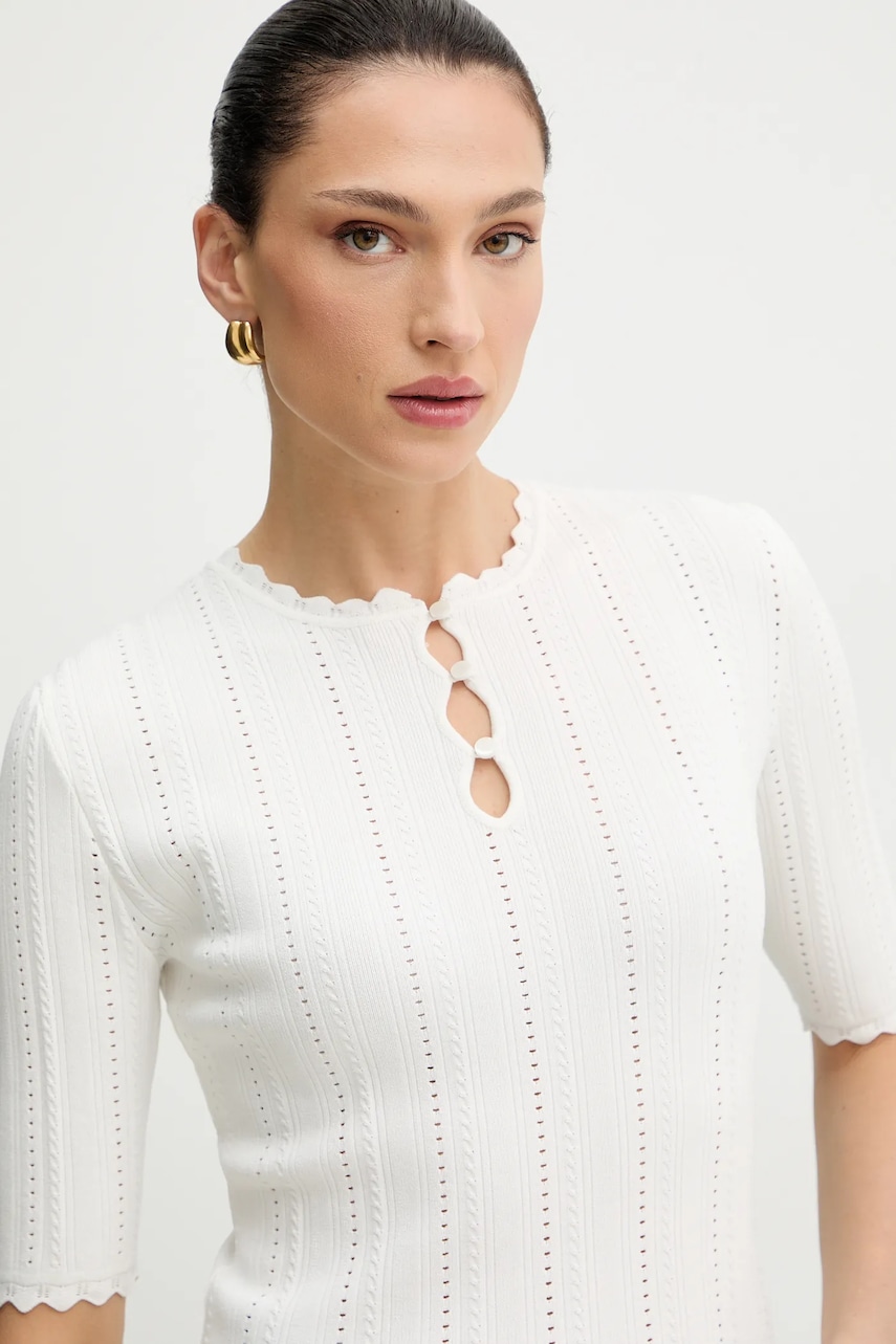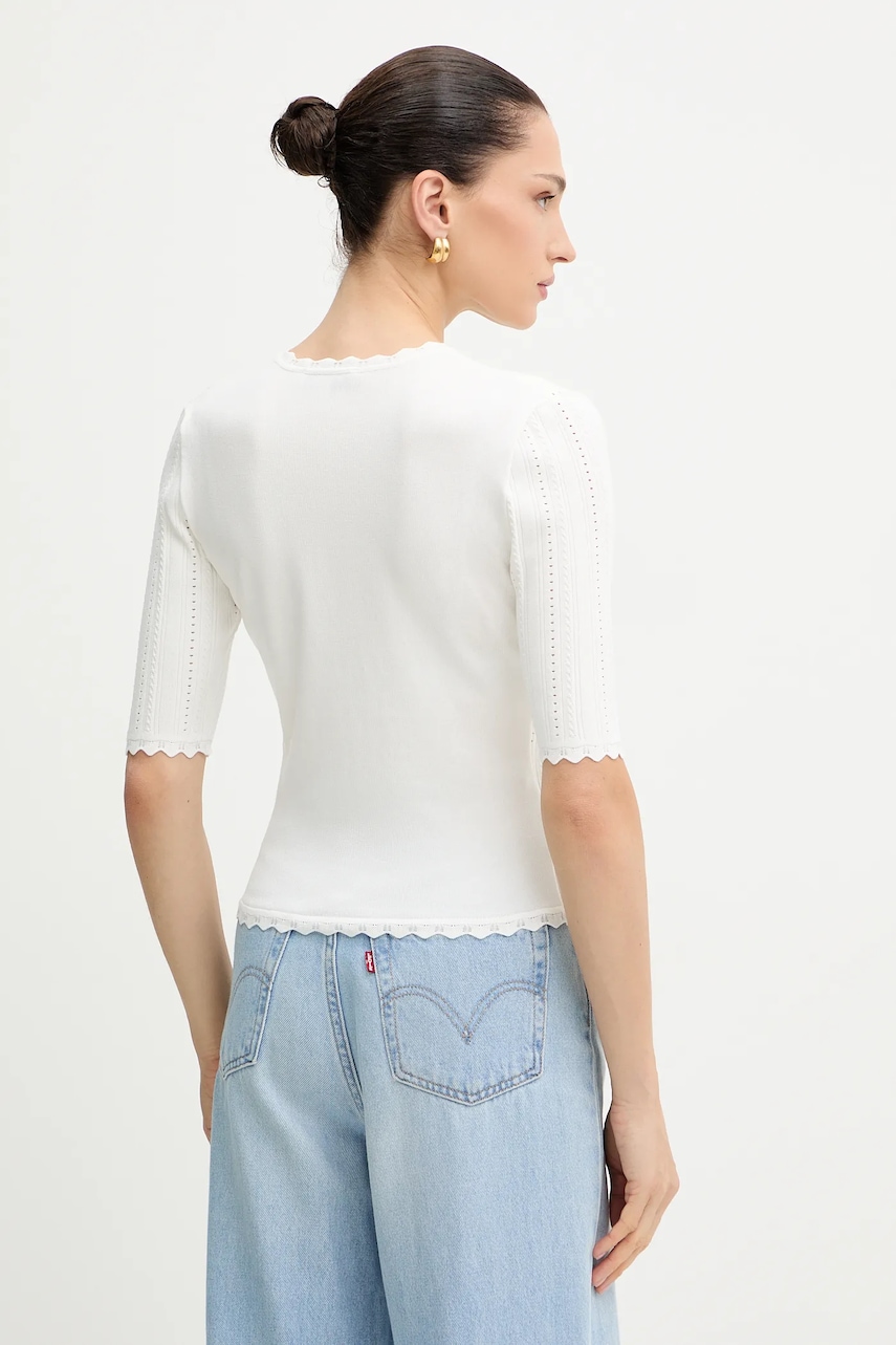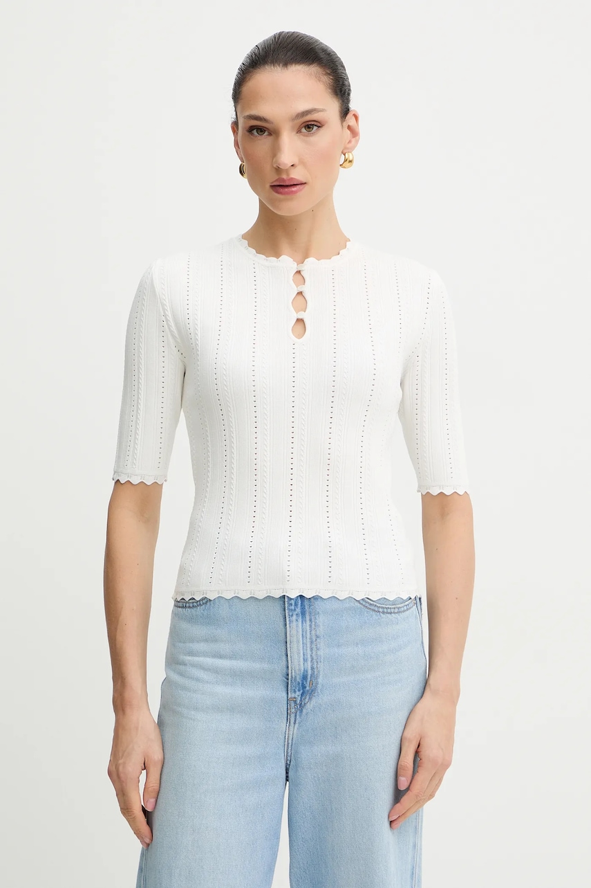 - Sweter w fasonie regular zapewnia wygodę i uniwersalny wygląd. Delikatnie dopasowuje się do sylwetki, ale nie podkreśla jej nadmiernie. Klasyczny i prosty, sprawdzi się zarówno w eleganckich, jak i casualowych stylizacjach. - Krótkie zapięcie na guziki. - Ozdobne wykończenia. - Długość: 50 cm. - Szerokość pod pachami: 40 cm. - Wymiary podane dla rozmiaru: S.