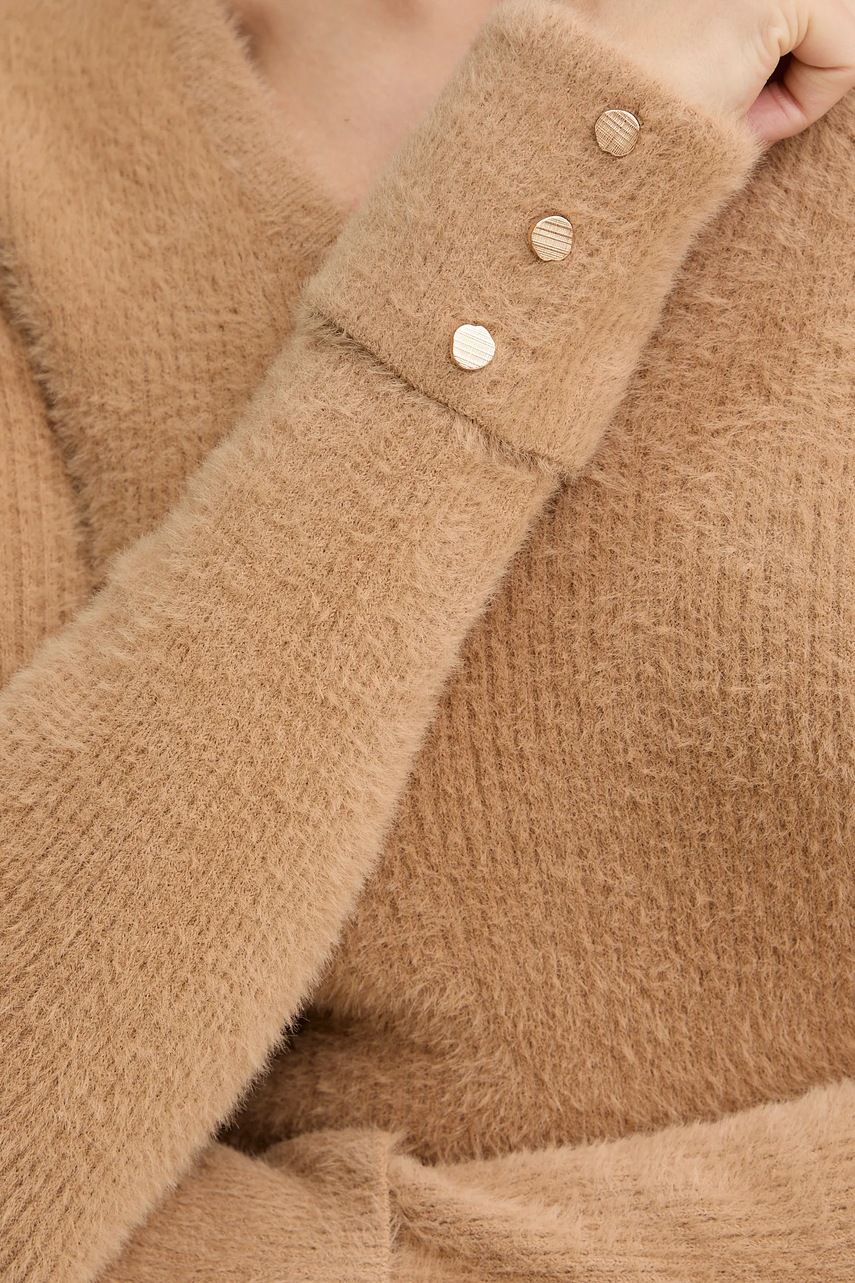 - Dopasowany fason nie krępujący ruchów. - Spiczasty dekolt. - Długi rękaw. - Prążkowana dzianina. - Cienka, elastyczna dzianina. - Długość: 58 cm. - Szerokość pod pachami: 38 cm. - Wymiary podane dla rozmiaru: S.