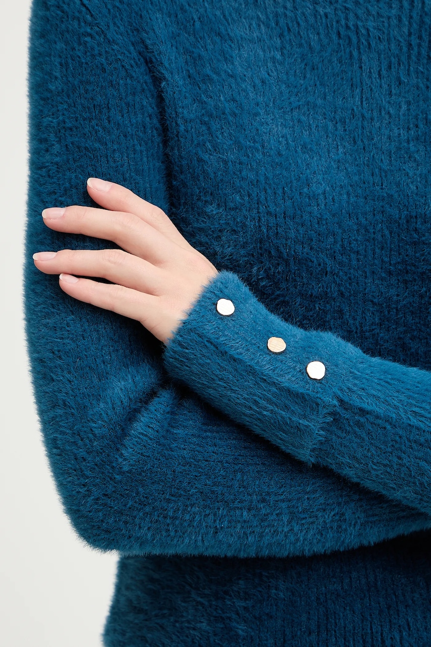 - Dopasowany fason. - Model z półgolfem. - Ozdobne guziki. - Dzianina średniej grubości. - Długość rękawa: 68 cm. - Długość: 66 cm. - Szerokość pod pachami: 43 cm. - Wymiary podane dla rozmiaru: XL.