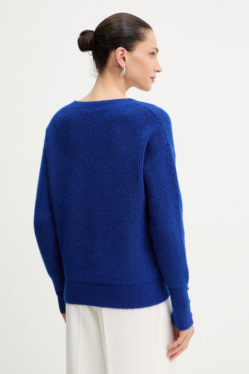 - Sweter w fasonie regular zapewnia wygodę i uniwersalny wygląd. Delikatnie dopasowuje się do sylwetki, ale nie podkreśla jej nadmiernie. Klasyczny i prosty, sprawdzi się zarówno w eleganckich, jak i casualowych stylizacjach. - Krój rękawa z obniżoną linią ramion nie ogranicza mobilności. - Spiczasty dekolt. - Materiał z metaliczną nicią. - Cienka, elastyczna dzianina. - Rękawy i dolna krawędź zakończona ściągaczami chroniącymi przed niekorzystnymi warunkami atmosferycznymi. - Długość rękawa(mierzona od dekoltu): 75 cm. - Długość: 59 cm. - Szerokość pod pachami: 55 cm. - Wymiary podane dla rozmiaru: S.