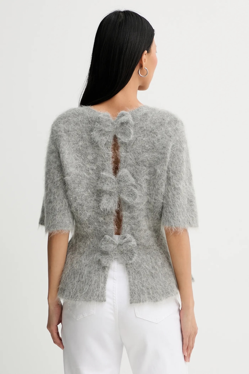 - Prosty, nie blokujący ruchów fason. - Klasyczny, okrągły dekolt. - Krótki rękaw. - Ozdobne wycięcia na plecach. - Dzianina średniej grubości. - Długość: 57 cm. - Szerokość pod pachami: 48 cm. - Wymiary podane dla rozmiaru: 36.