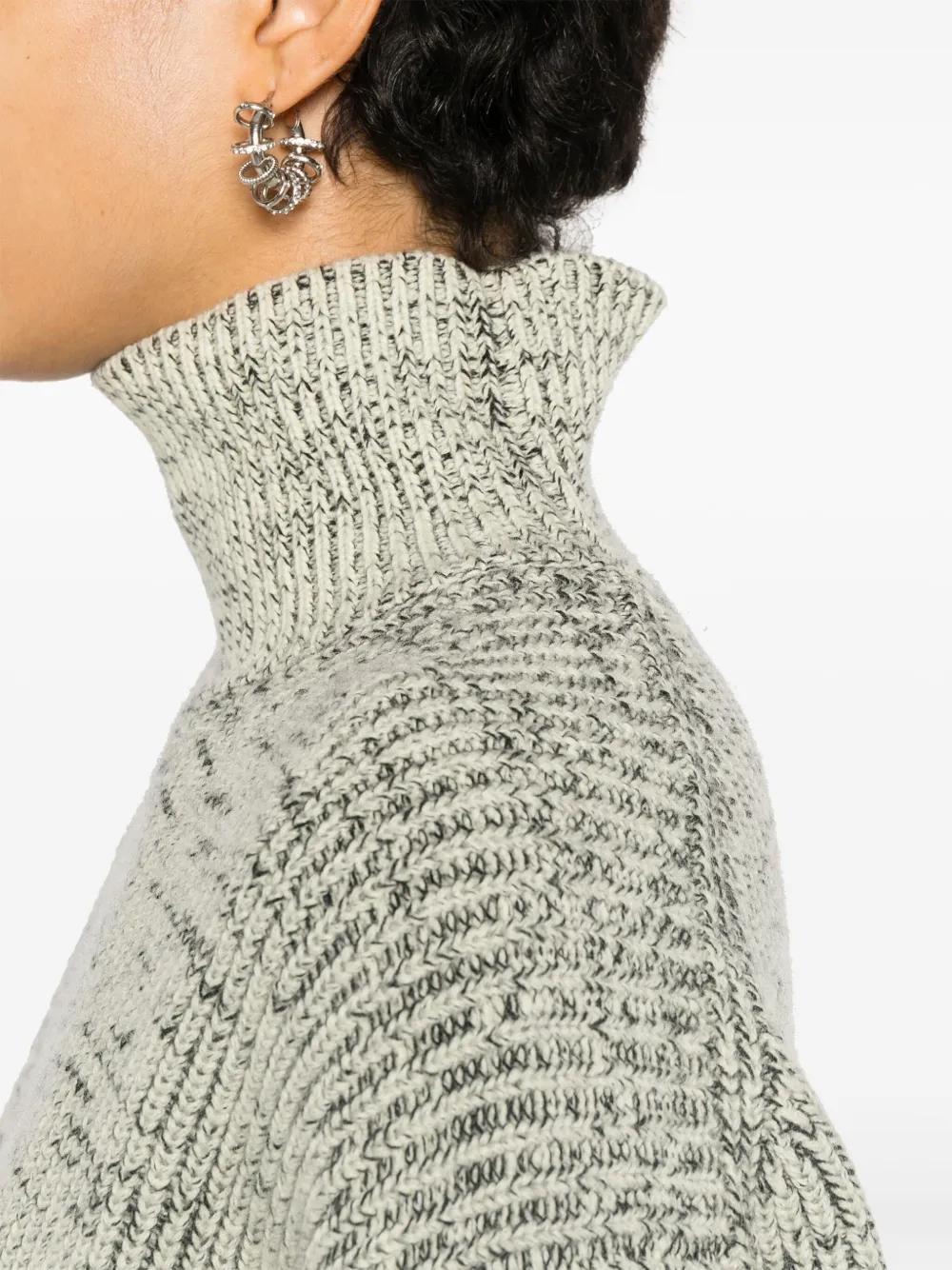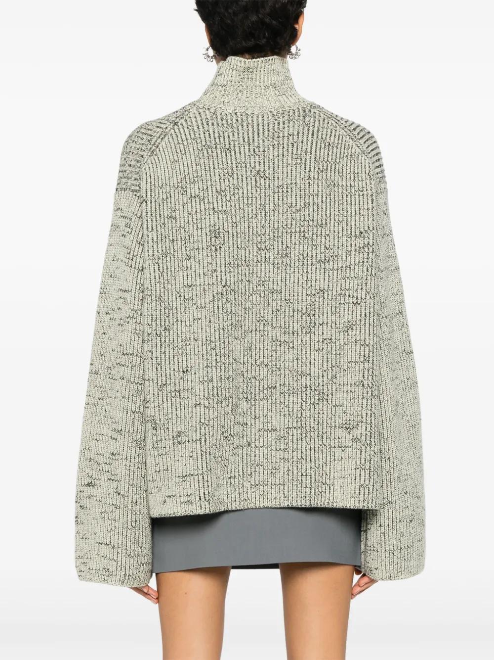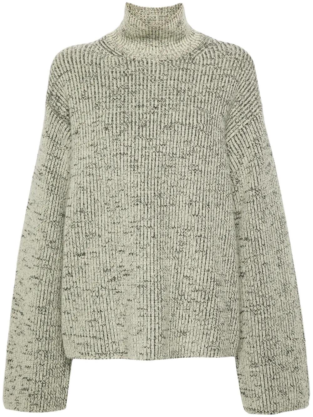beige/grey virgin wool blend fisherman's knit mélange effect high neck drop shoulder long sleeves straight hem
