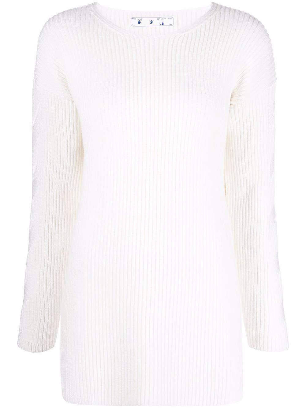 white virgin wool ribbed knit round neck drop shoulder long sleeves straight hem