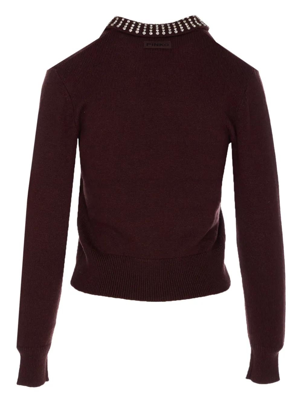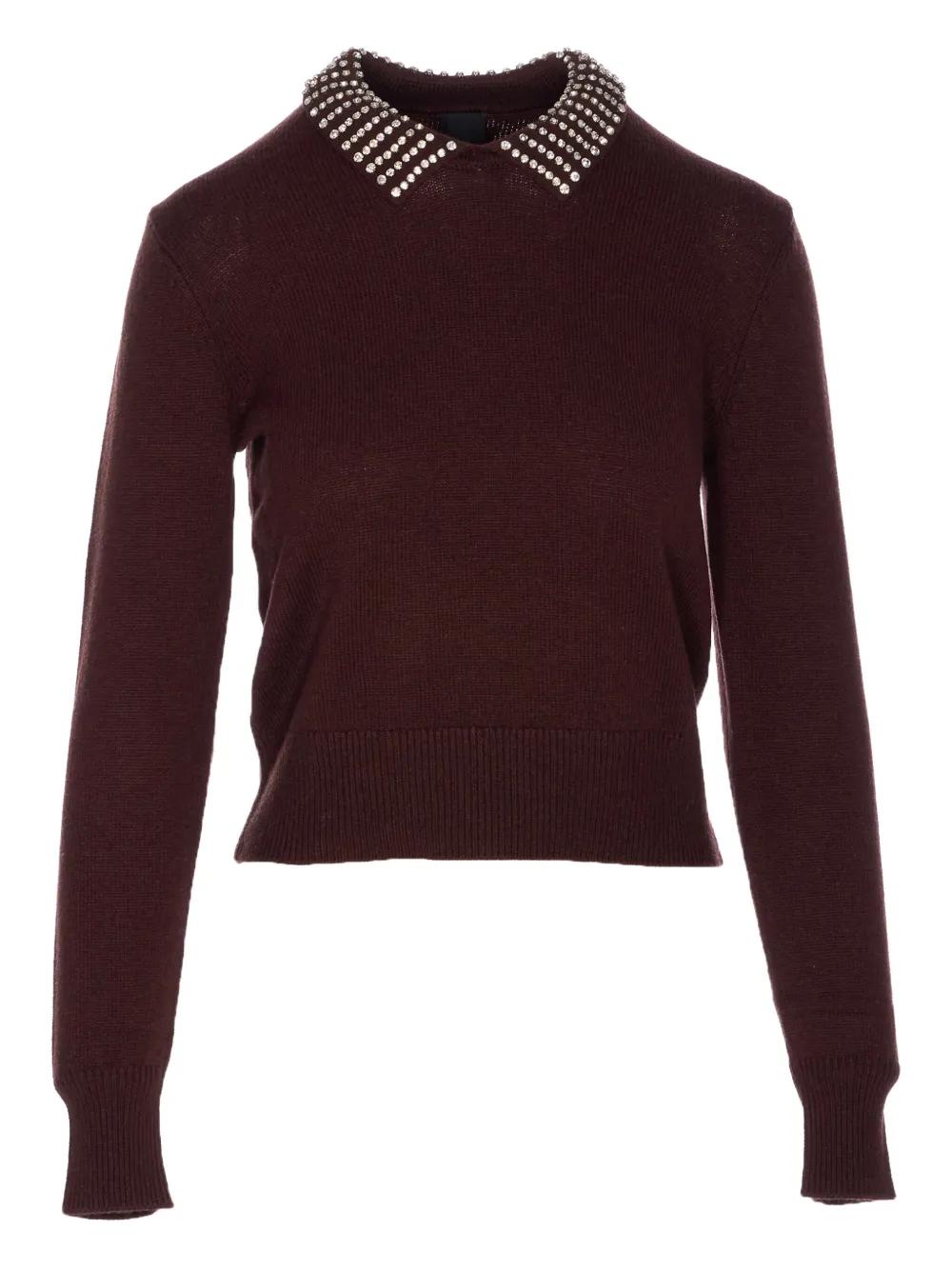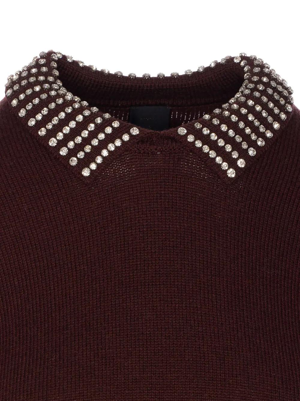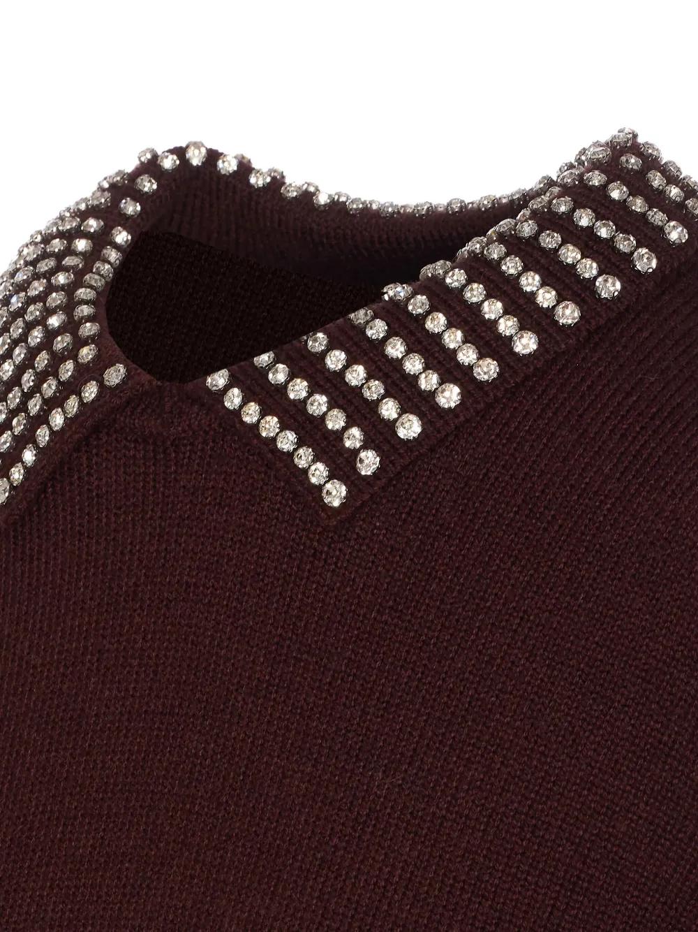 brown crystal embellishments crew neck long sleeves ribbed hem knit texture
