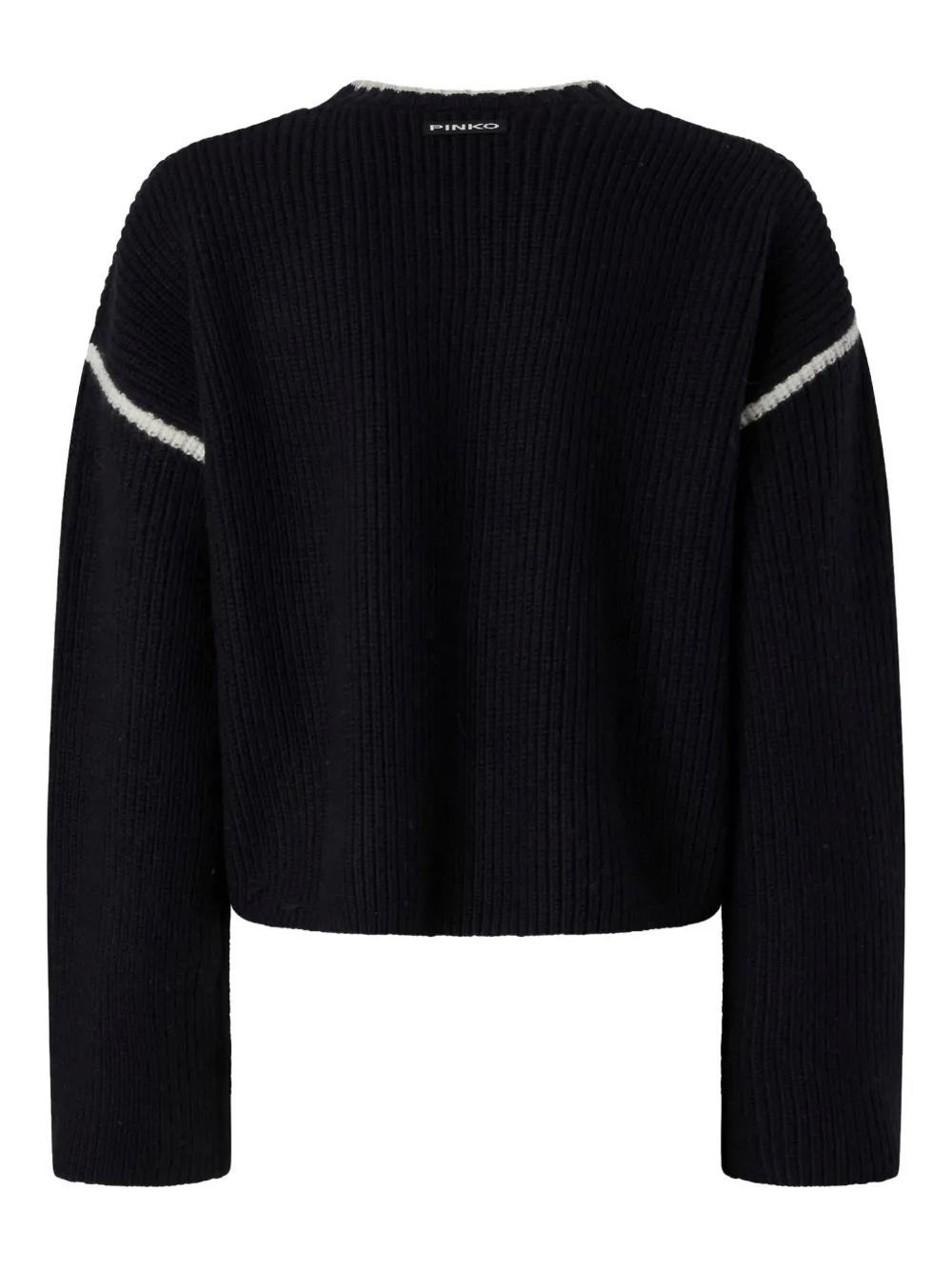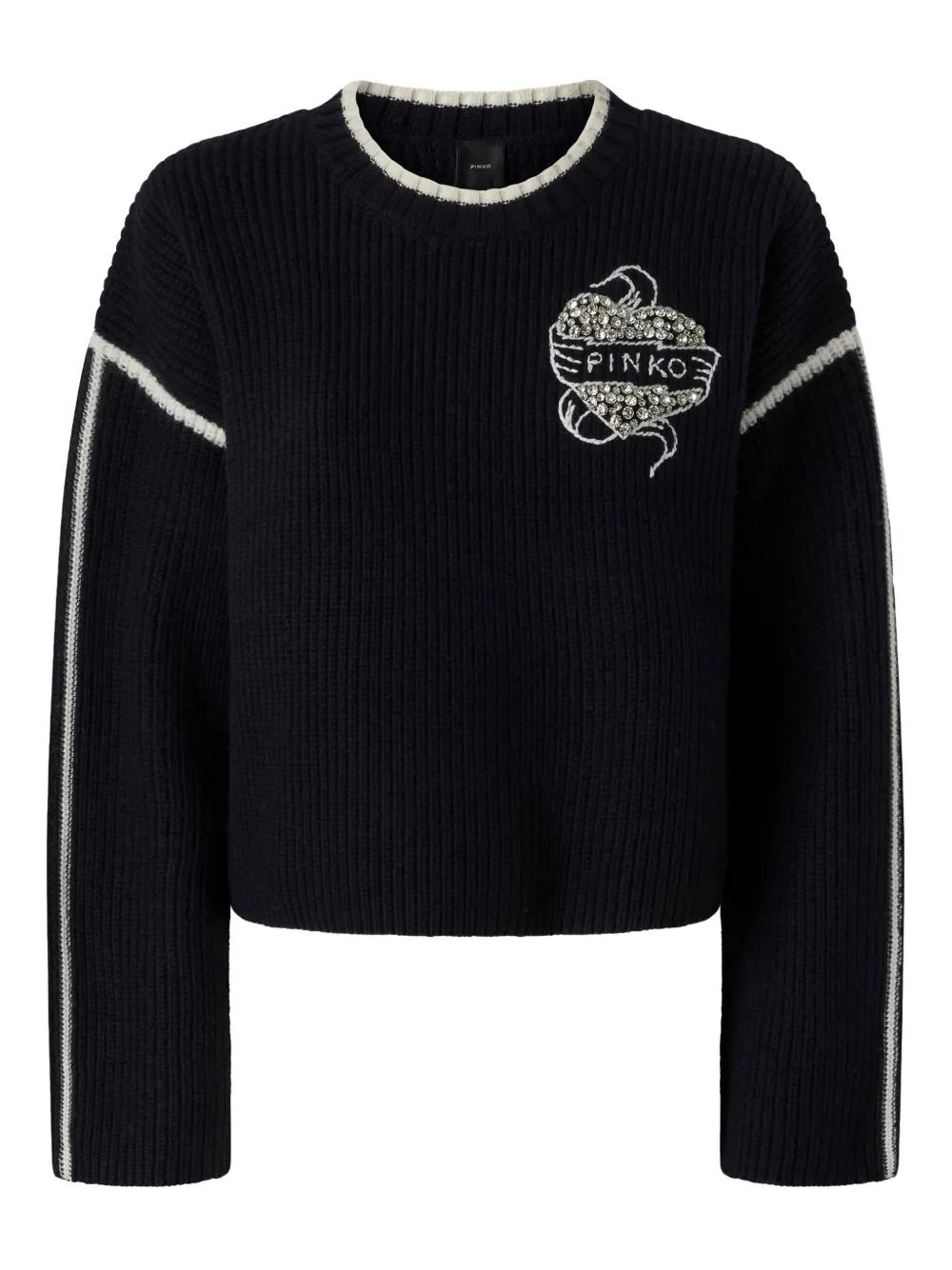 black crew neck contrasting trim long sleeves intarsia-knit logo