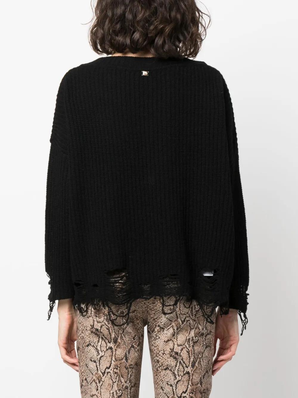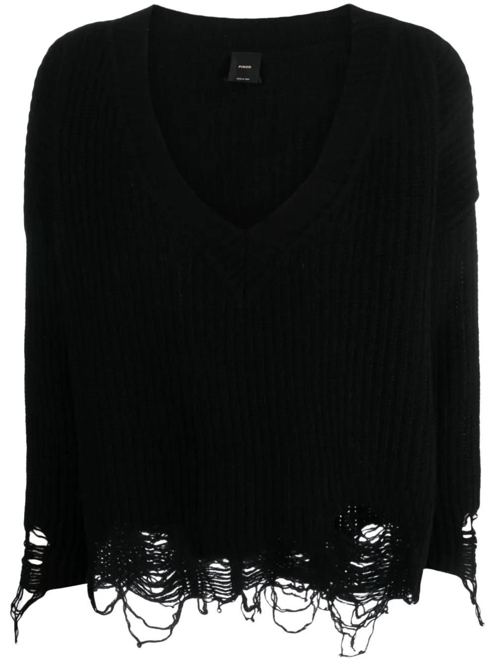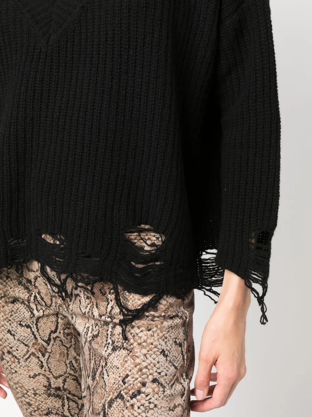 black wool blend knitted construction ripped detailing plunging V-neck drop shoulder long sleeves