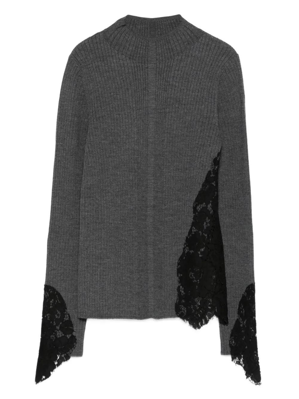 grey ribbed knit lace detail round neck long sleeves straight hem