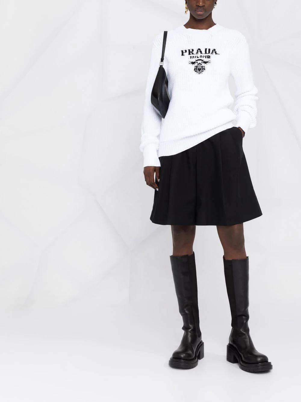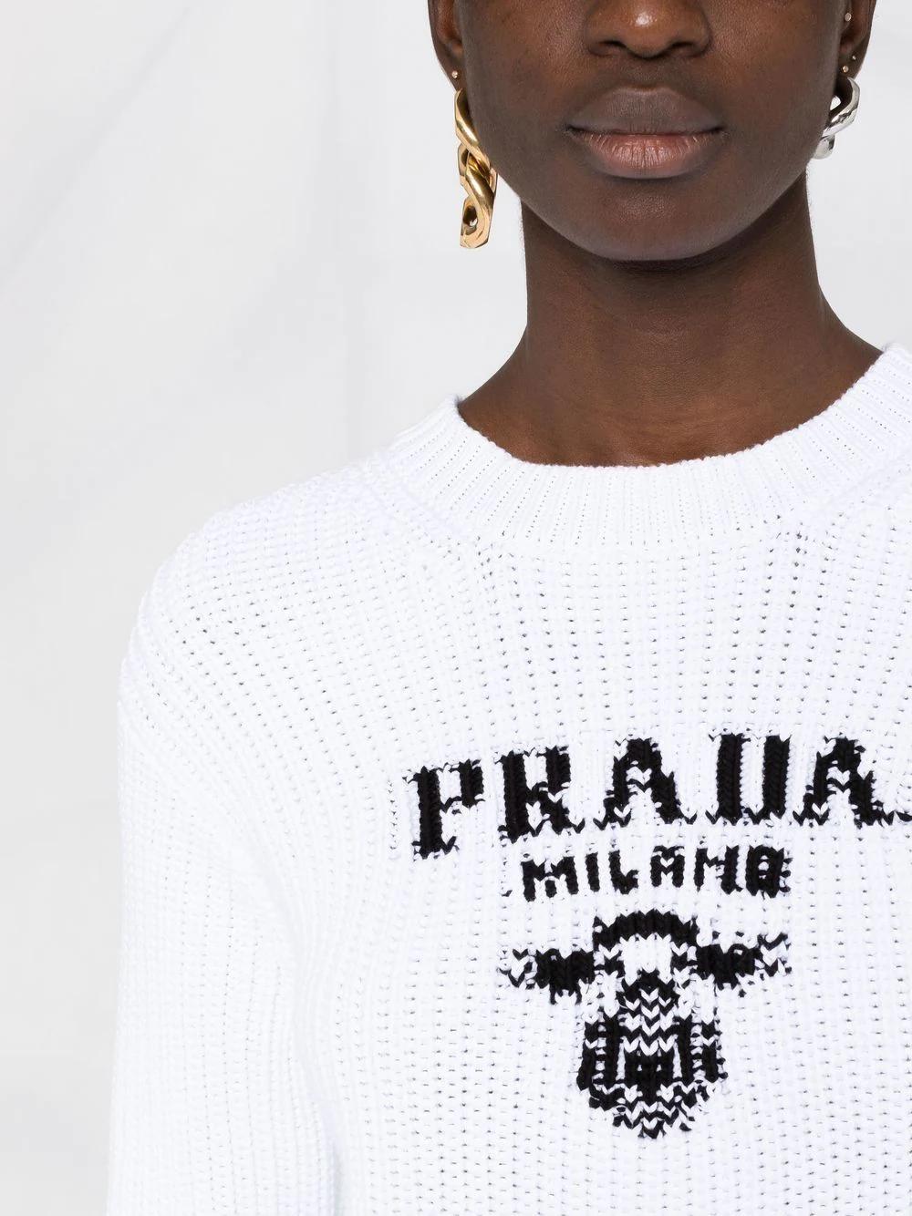 intarsia-knit logo jumper from PRADA featuring white, cotton, drop-stitch knit, intarsia-knit logo, ribbed-knit edge, round neck, drop shoulder, long sleeves and straight hem.