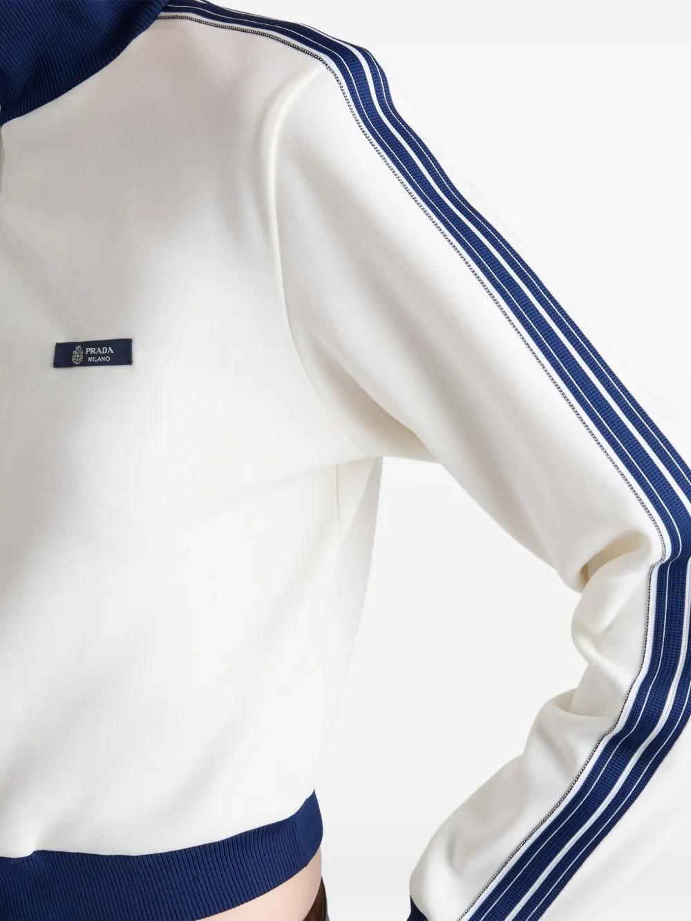neutral ribbed knit collar, hem, and cuffs zip closure knit stripes sleeves leather elbow patches logo label