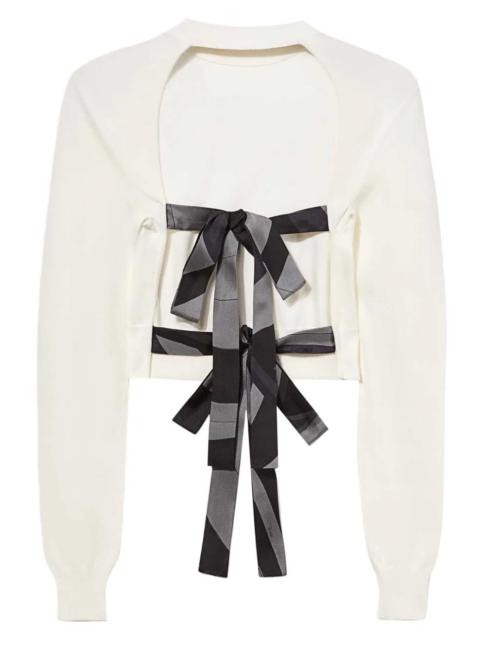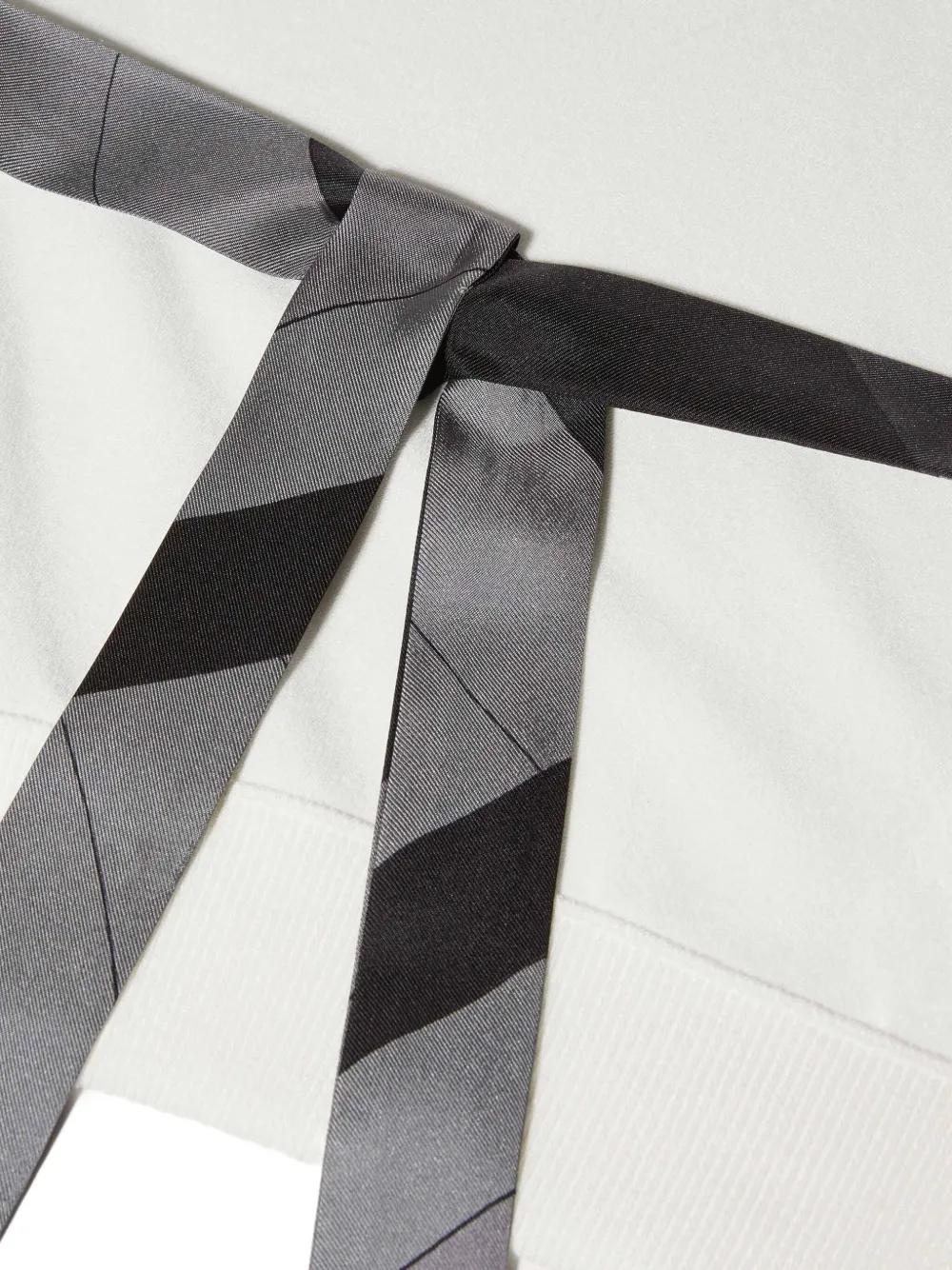 white silk-twill detail tie fastening round neck long sleeves ribbed trims