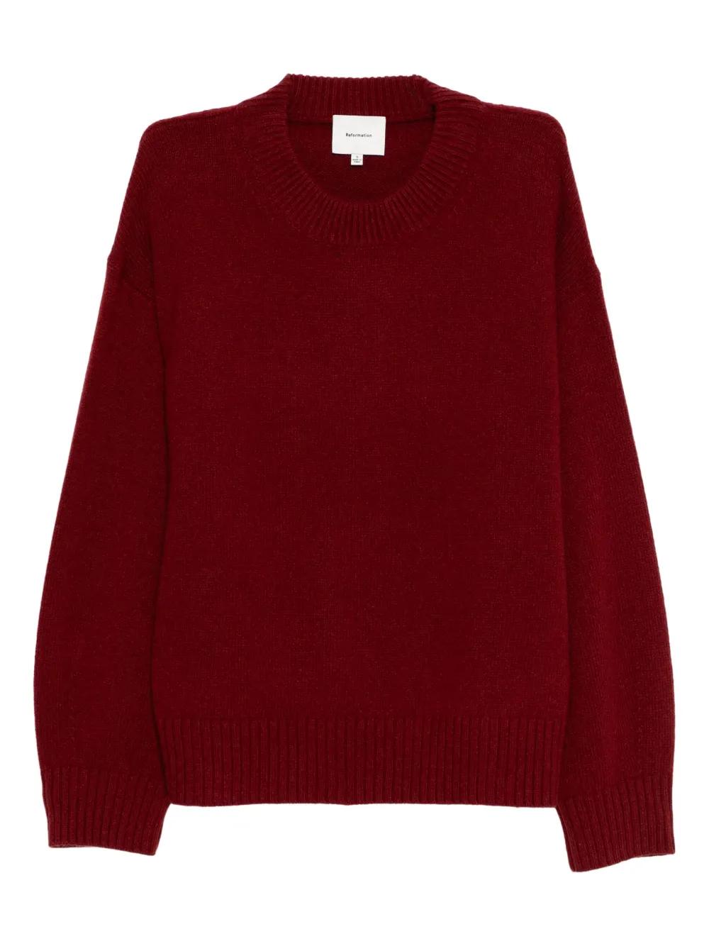 chestnut brown recycled viscose blend knitted construction fine ribbed crew neck long sleeves straight hem