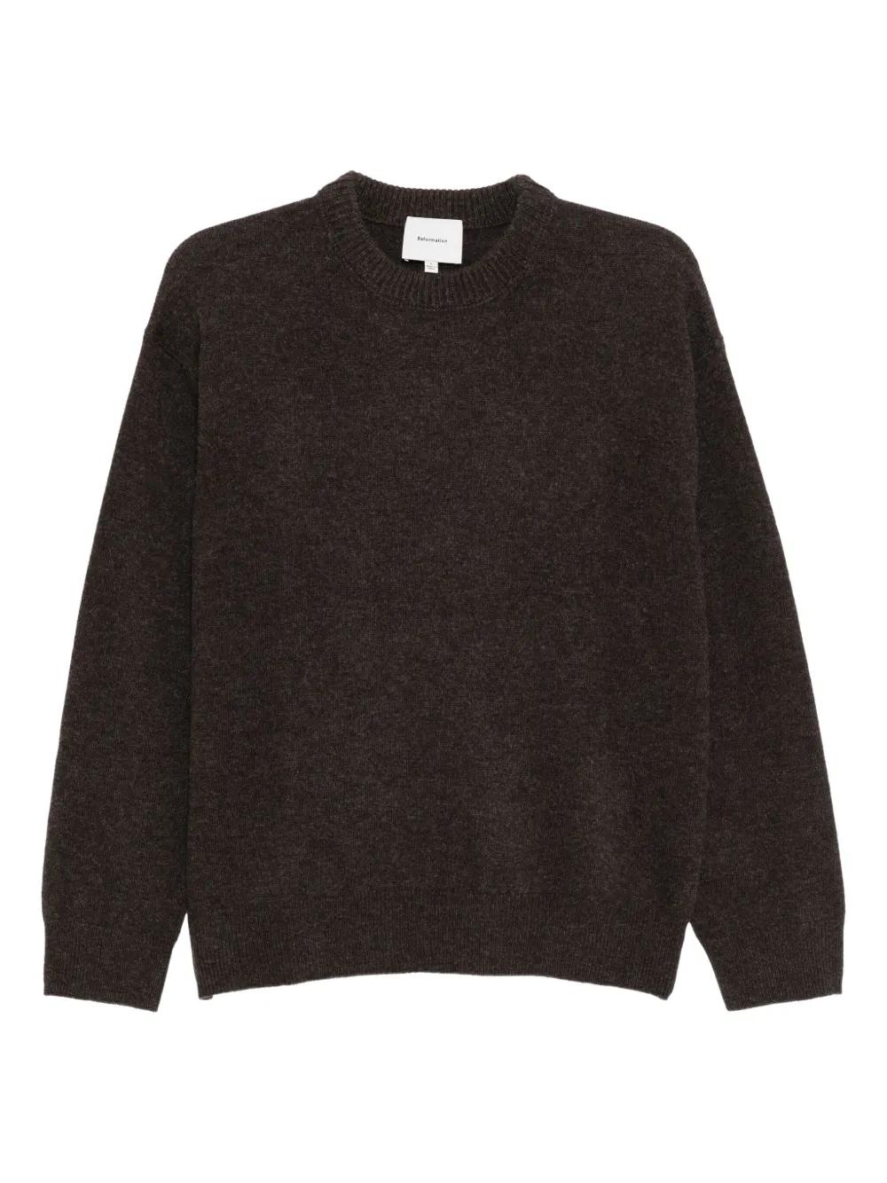chestnut brown recycled viscose blend knitted construction fine ribbed crew neck long sleeves straight hem