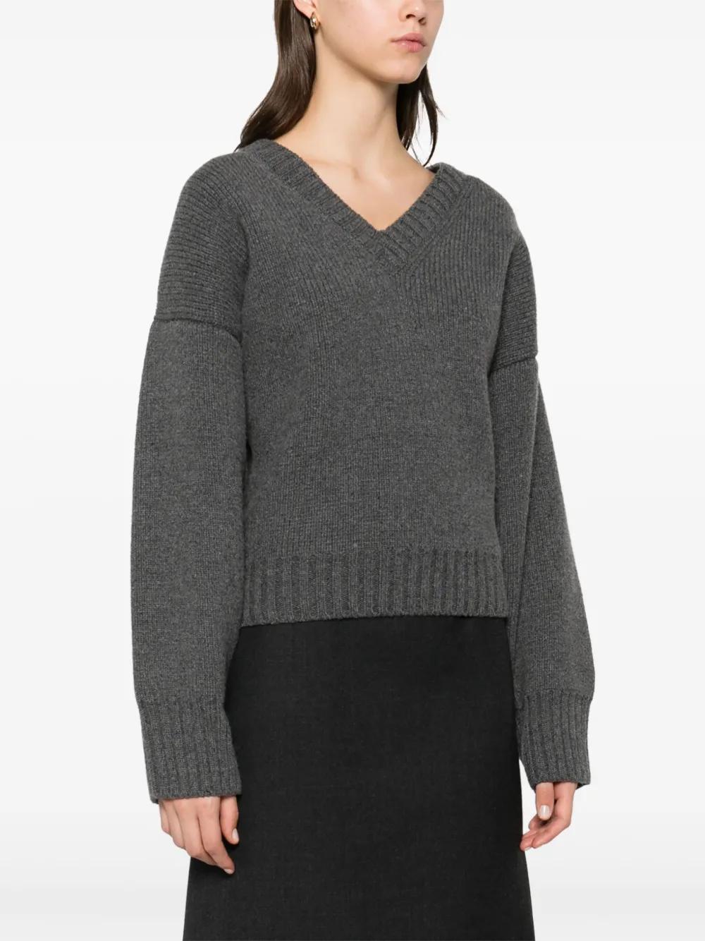 medium grey wool ribbed knit mélange effect ribbed V-neck drop shoulder long sleeves ribbed cuffs and hem