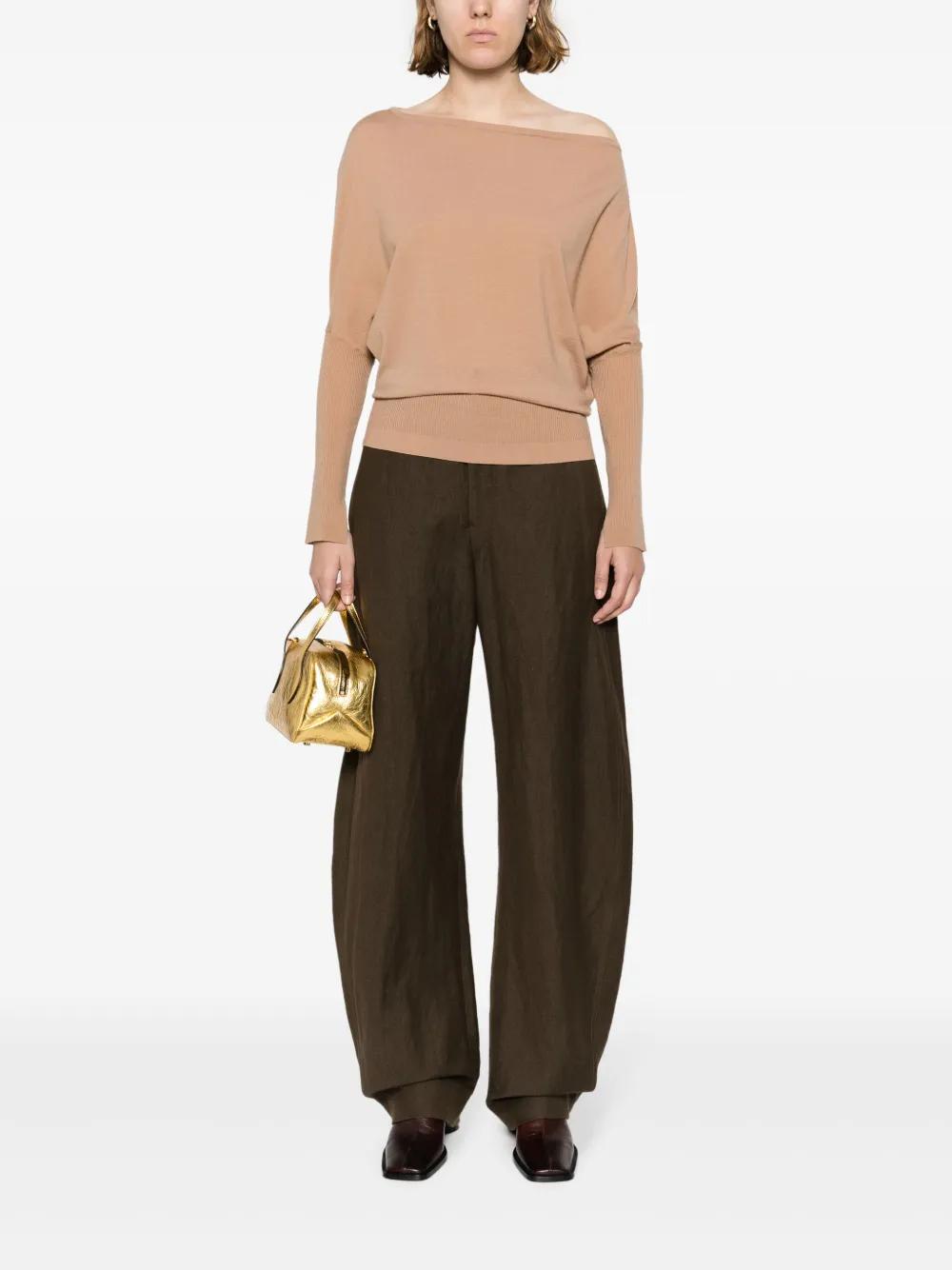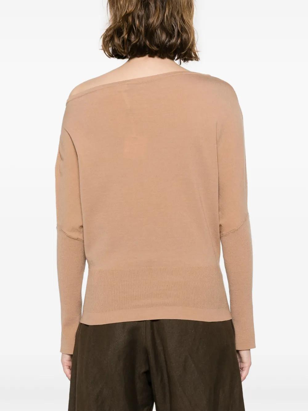 camel brown wool blend knitted construction draped design off-shoulder long sleeves ribbed cuffs and hem