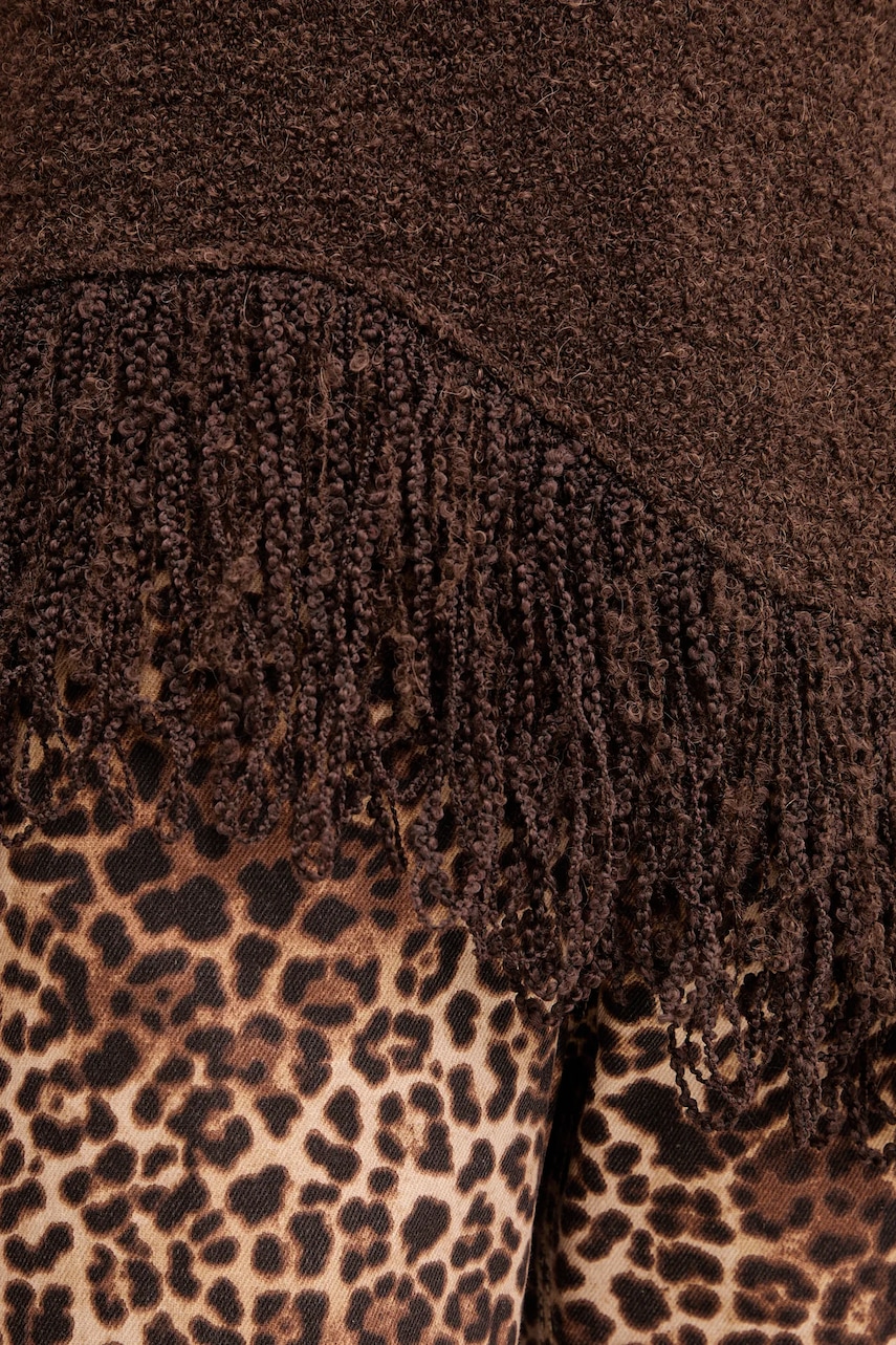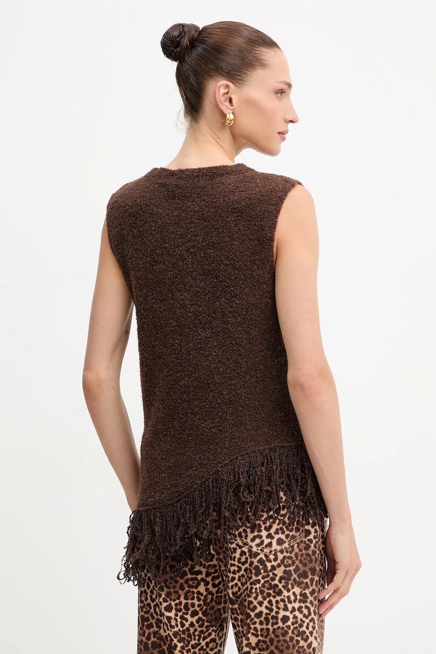 - Prosty, nie blokujący ruchów fason. - Klasyczny, okrągły dekolt. - Model na szerokich ramiączkach. - Asymetryczna dolna krawędź. - Model z ozdobnymi frędzlami. - Elastyczna dzianina o średniej grubości. - Długość: 80 cm / 62 cm. - Szerokość pod pachami: 48 cm. - Wymiary podane dla rozmiaru: 36.
