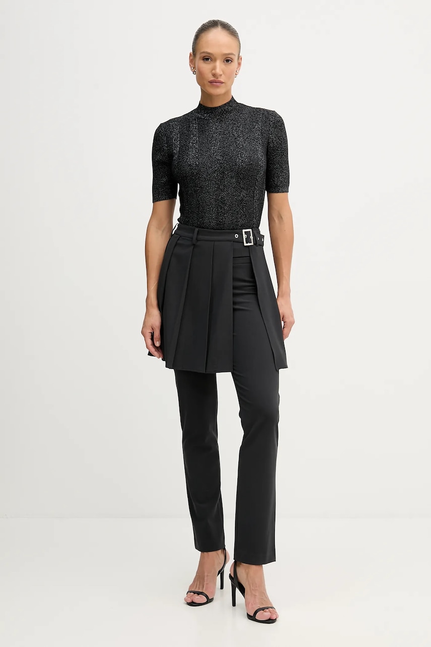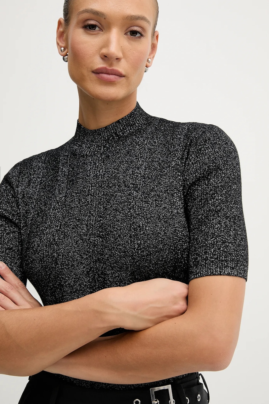 - Prosty, nie blokujący ruchów fason. - Model z półgolfem. - Krótki rękaw. - Materiał z metaliczną nicią. - Długość: 49 cm. - Szerokość pod pachami: 43 cm. - Wymiary podane dla rozmiaru: S,