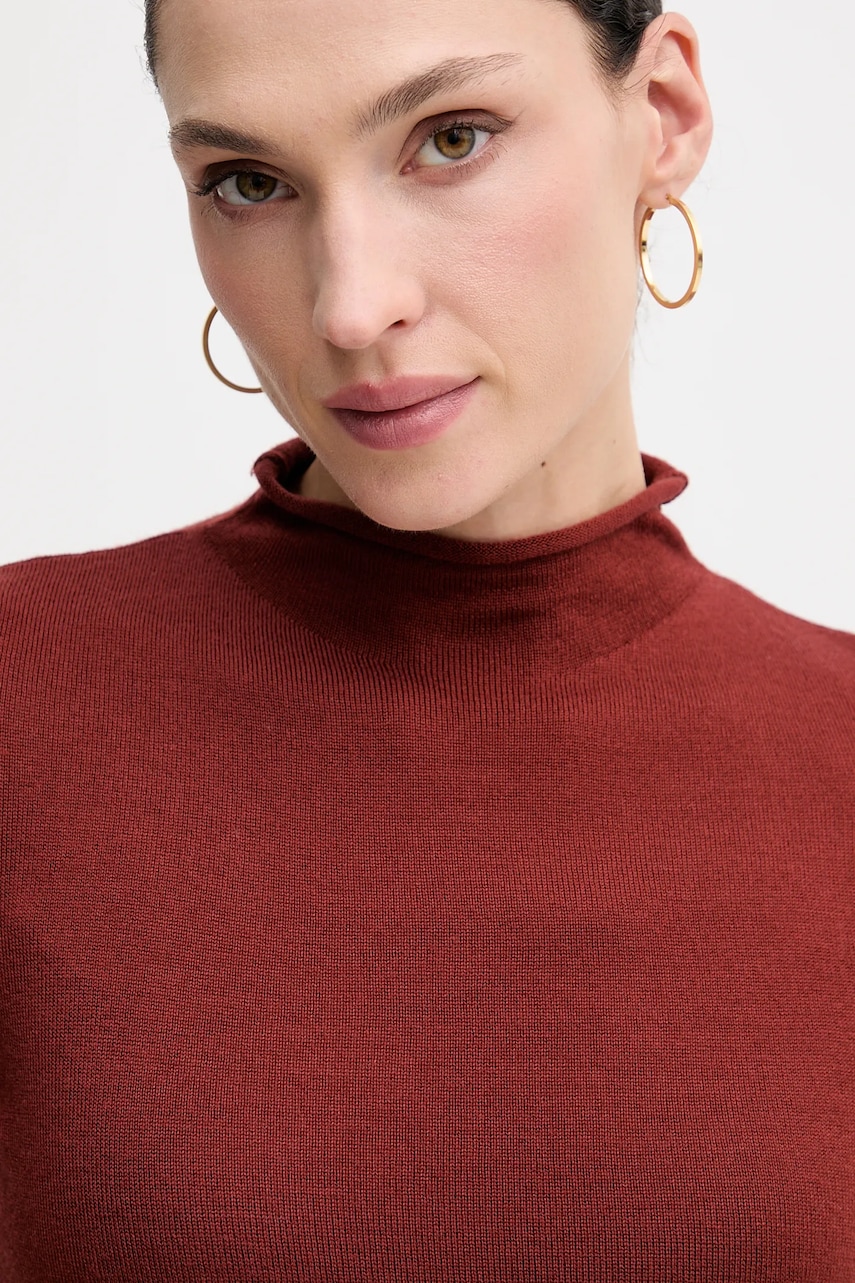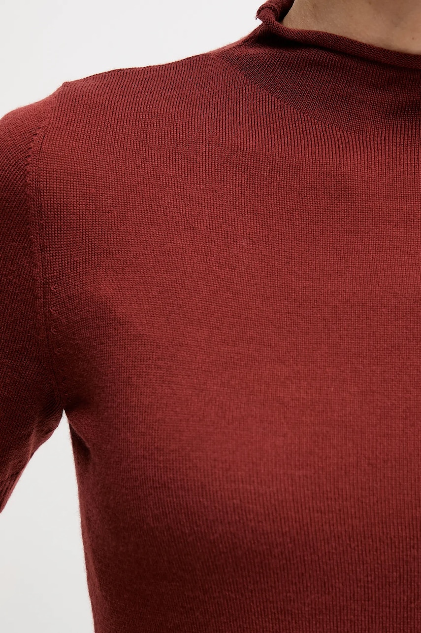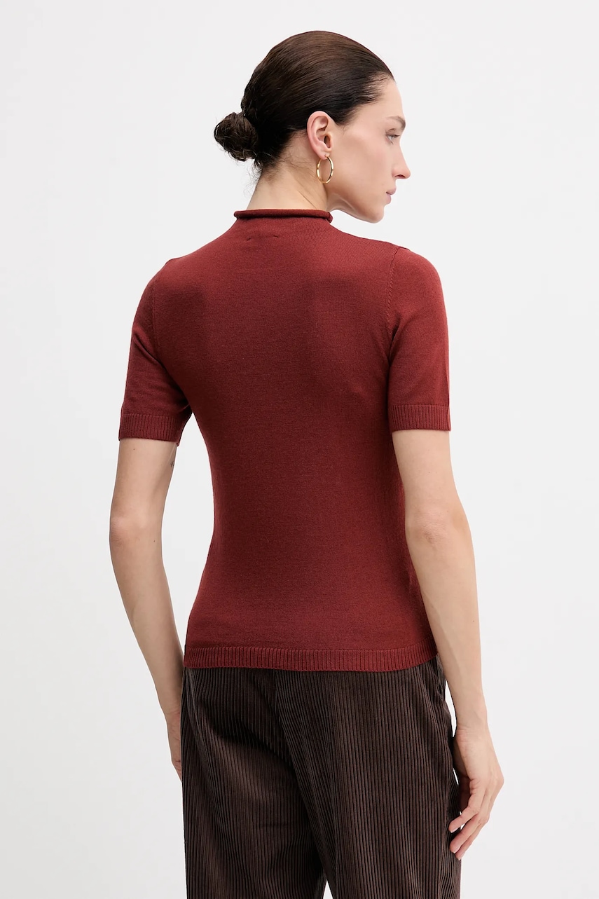 - Prosty, nie blokujący ruchów fason. - Model z półgolfem. - Cienka, elastyczna dzianina. - Krótki rękaw. - Długość: 57 cm. - Szerokość pod pachami: 43 cm. - Wymiary podane dla rozmiaru: S.