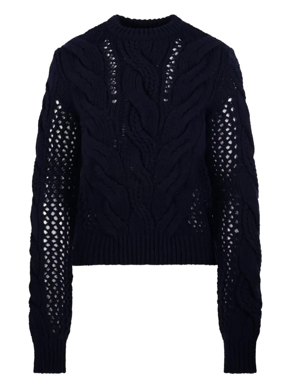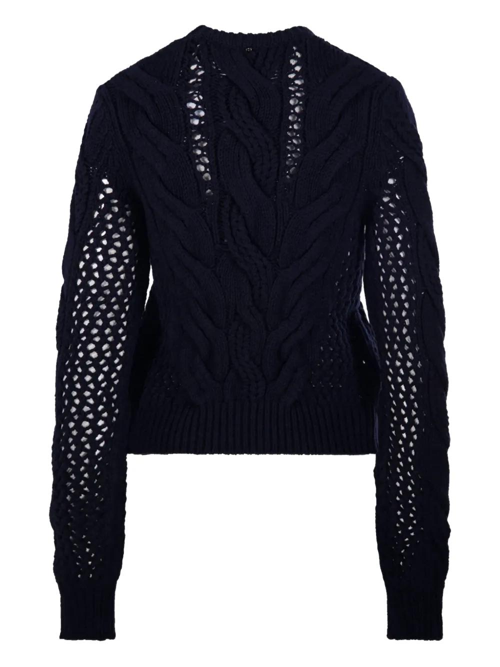 dark blue cable knit crew neck long sleeve ribbed cuffs and hem wool-blend