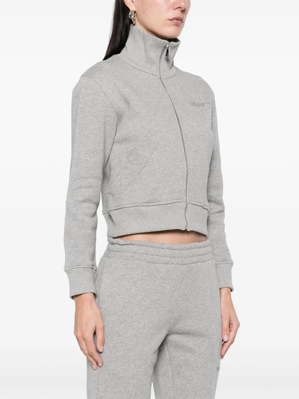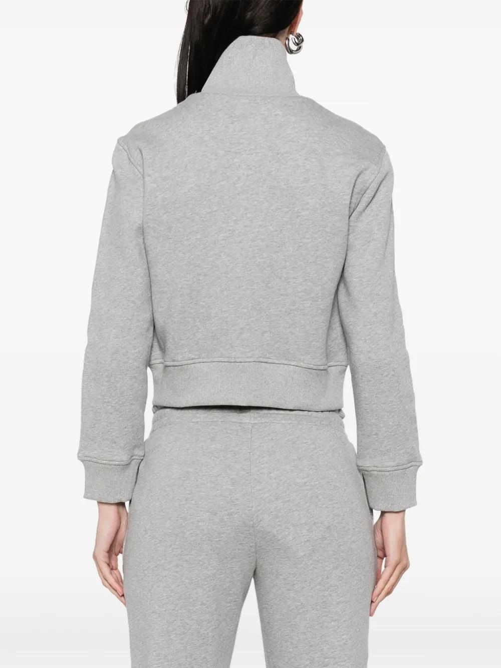 heather grey front zip fastening two side welt pockets ribbed cuffs and hem high neck