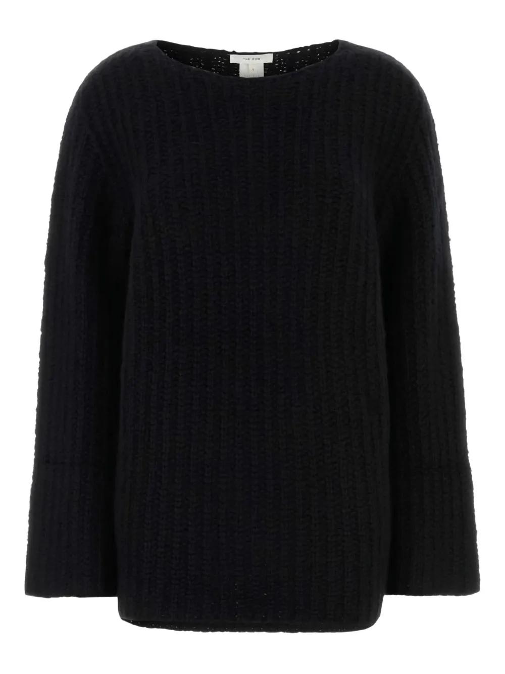 black cashmere crew neck long wide sleeves ribbed knit straight hem