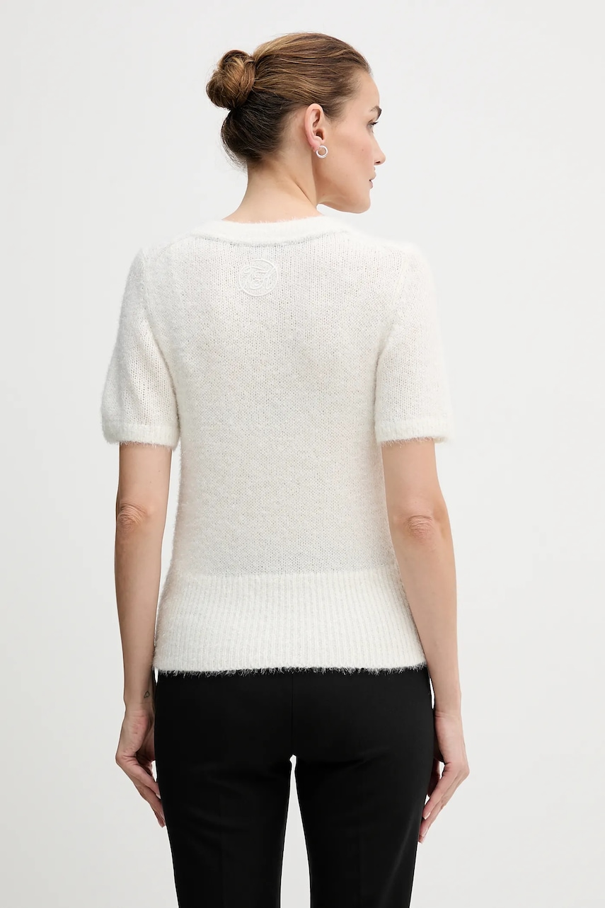 - Sweter w fasonie regular zapewnia wygodę i uniwersalny wygląd. Delikatnie dopasowuje się do sylwetki, ale nie podkreśla jej nadmiernie. Klasyczny i prosty, sprawdzi się zarówno w eleganckich, jak i casualowych stylizacjach. - Krótki rękaw. - Okrągły dekolt. - Materiał z metaliczną nicią. - Długość: 57 cm. - Szerokość pod pachami: 42 cm. - Wymiary podane dla rozmiaru: S.