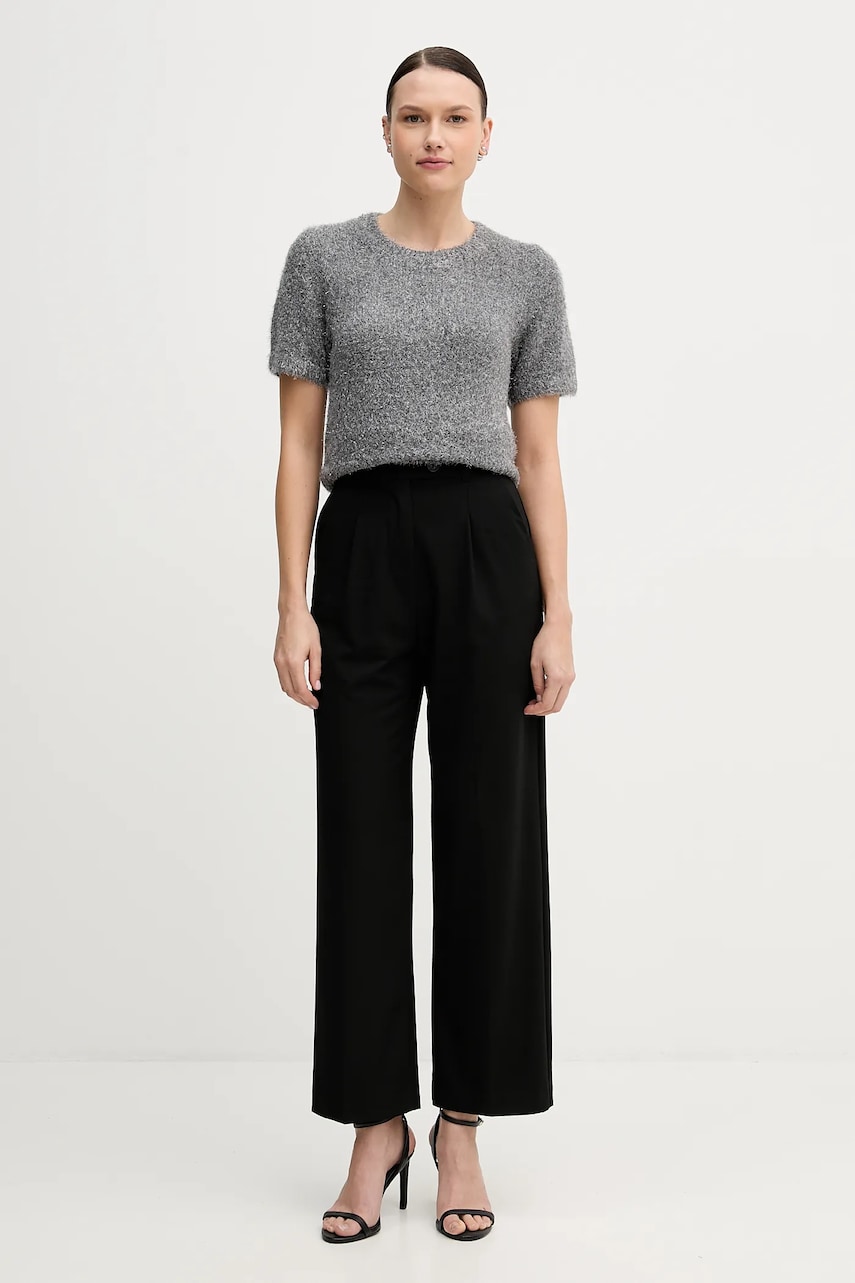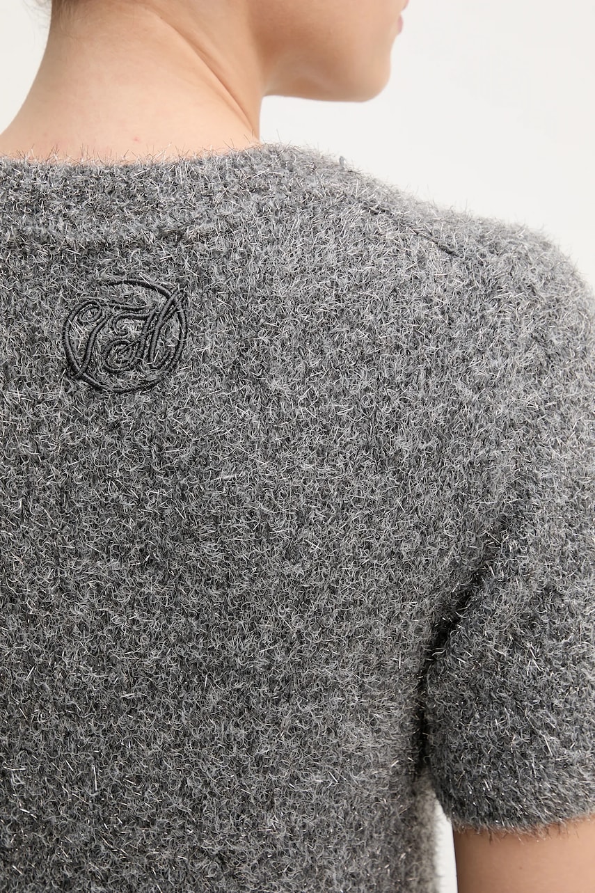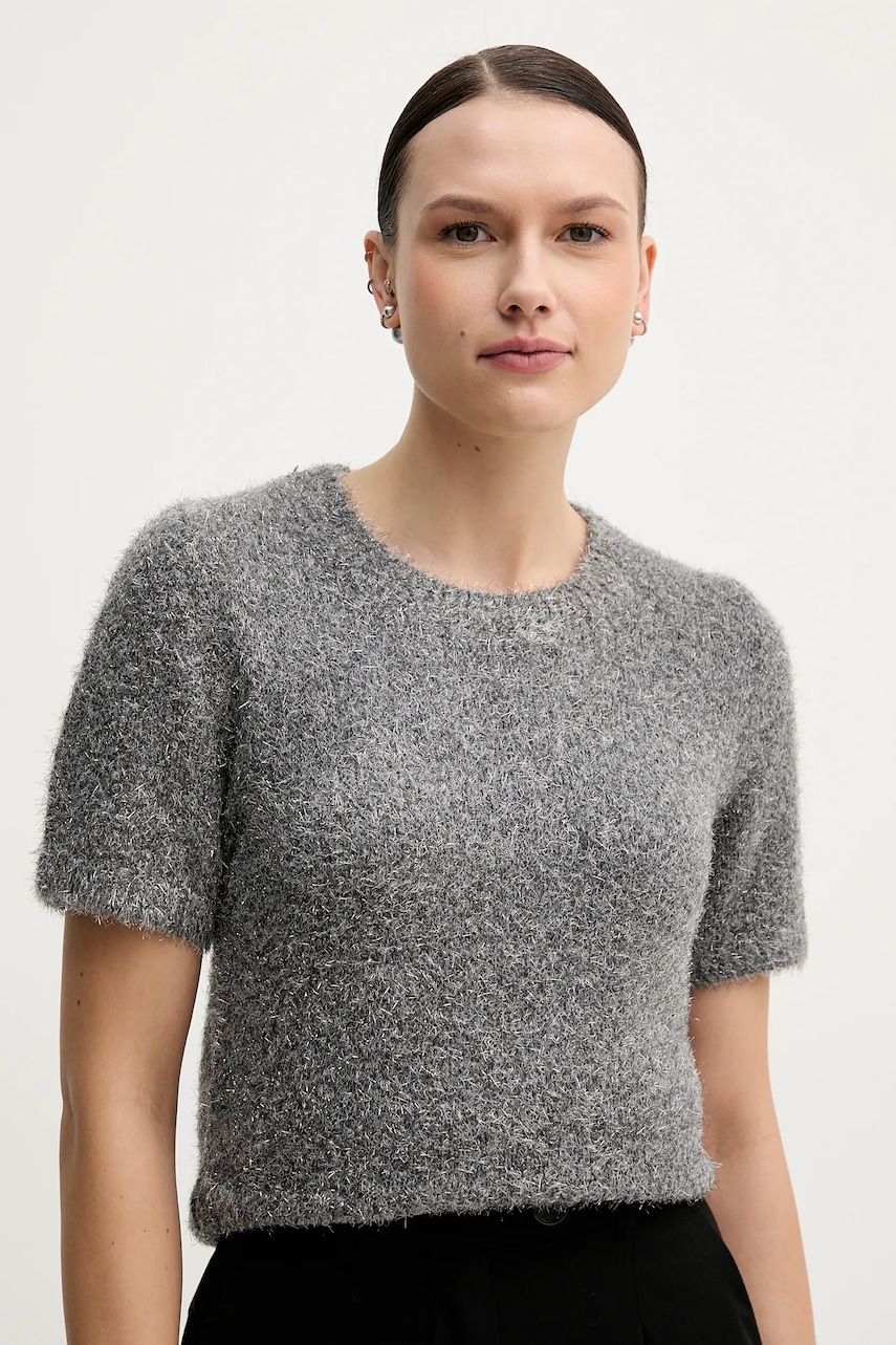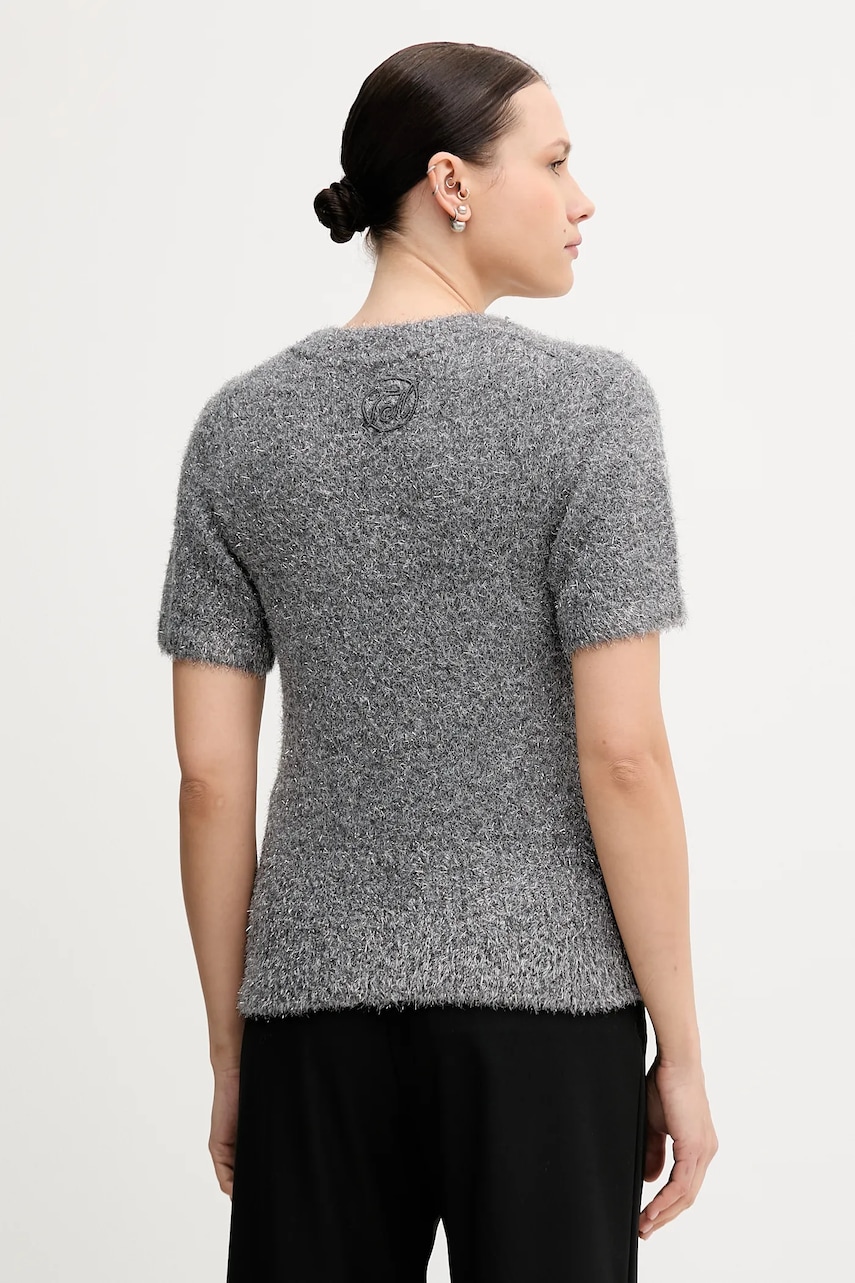 - Sweter w fasonie regular zapewnia wygodę i uniwersalny wygląd. Delikatnie dopasowuje się do sylwetki, ale nie podkreśla jej nadmiernie. Klasyczny i prosty, sprawdzi się zarówno w eleganckich, jak i casualowych stylizacjach. - Krótki rękaw. - Okrągły dekolt. - Materiał z metaliczną nicią. - Długość: 57 cm. - Szerokość pod pachami: 42 cm. - Wymiary podane dla rozmiaru: S.