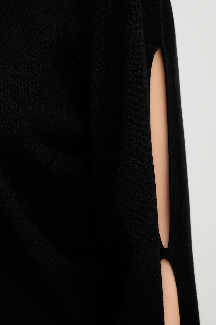 - Prosty, nie blokujący ruchów fason. - Długi rękaw. - Klasyczny, okrągły dekolt. - Ozdobne wycięcia.