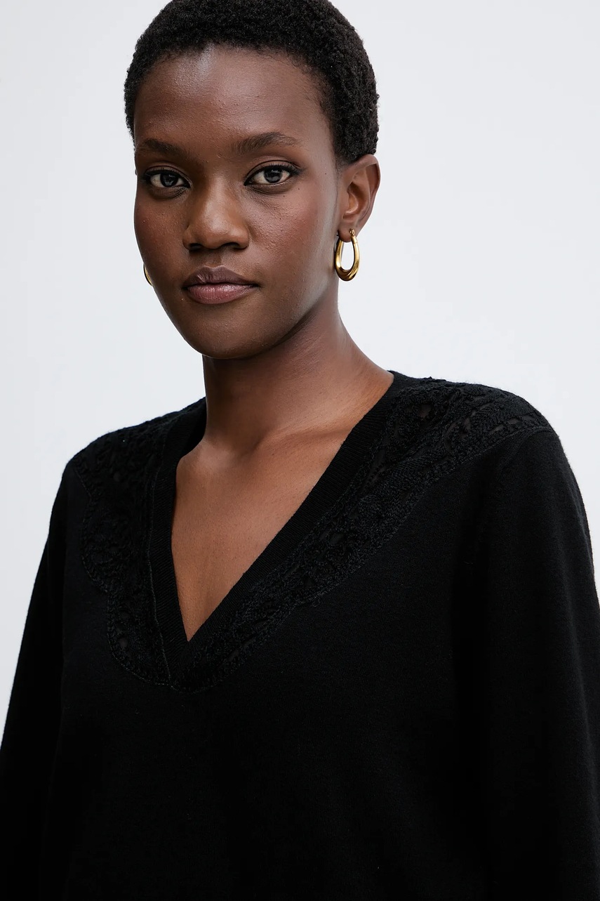 - Prosty, nie blokujący ruchów fason. - Ozdobny, spiczasty dekolt. - Długie, bufiaste rękawy. - Rękawy i dolna krawędź zakończona ściągaczami chroniącymi przed niekorzystnymi warunkami atmosferycznymi. - Model z koronkowymi wstawkami. - Długość rękawa: 58 cm. - Długość: 58 cm. - Szerokość pod pachami: 52 cm. - Wymiary podane dla rozmiaru: S.