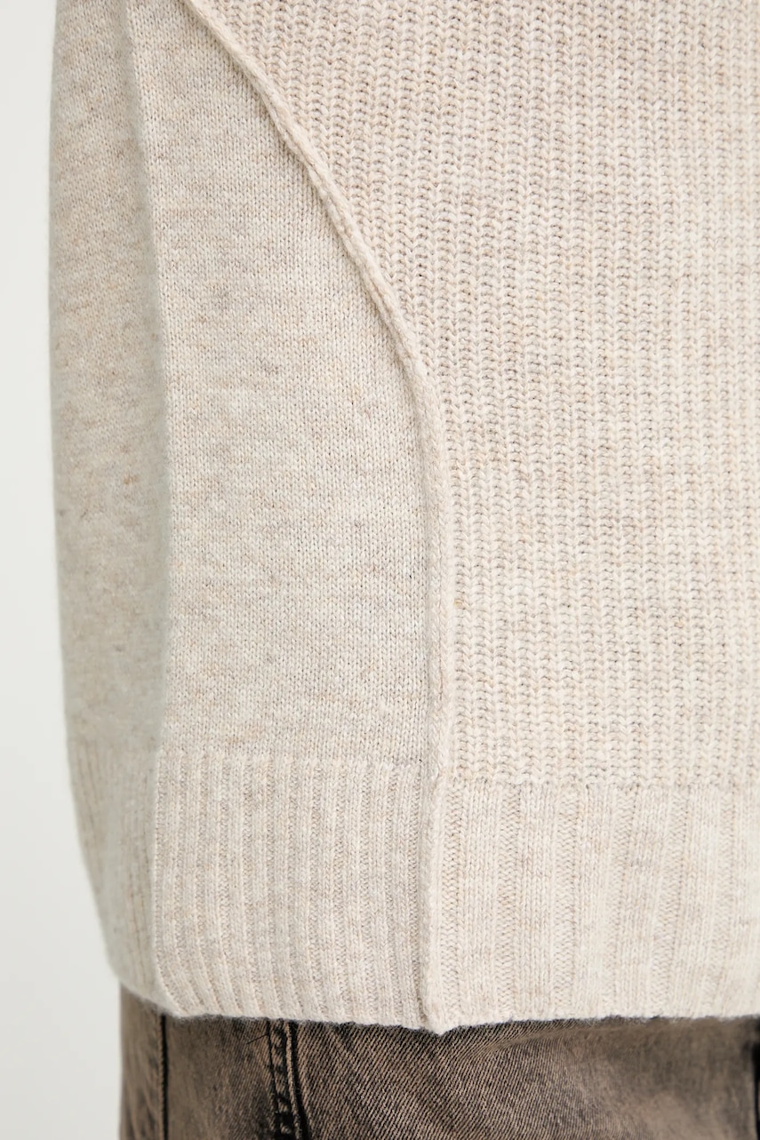 - Luźny krój zapewniający pełną swobodę ruchów. - Ozdobny, spiczasty dekolt. - Dzianina o różnych splotach. - Dzianina średniej grubości. - Długość: 58 cm. - Szerokość pod pachami: 52 cm. - Wymiary podane dla rozmiaru: S.