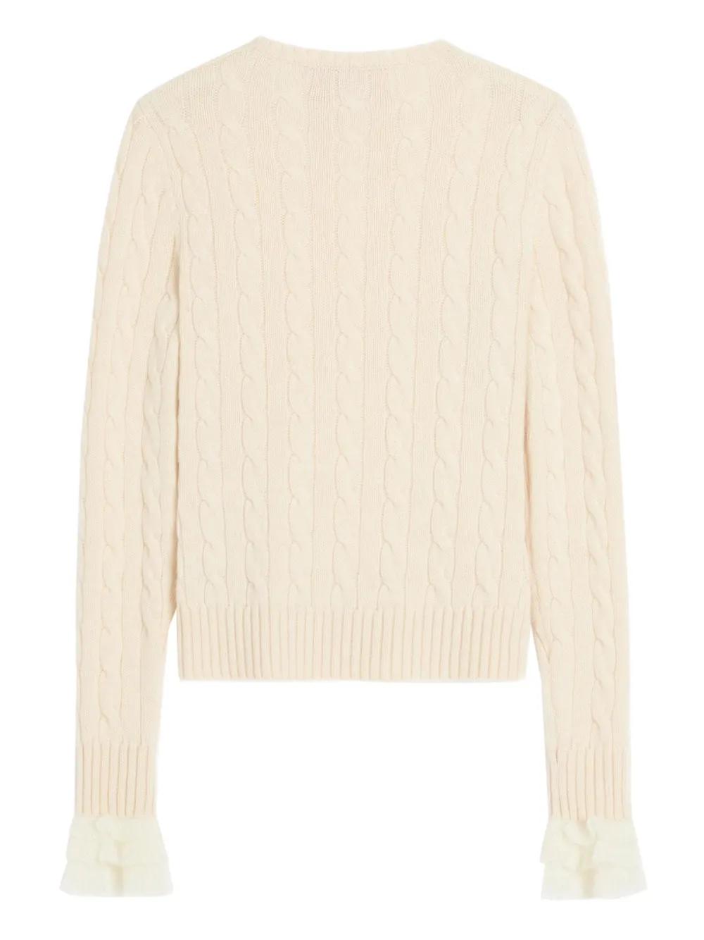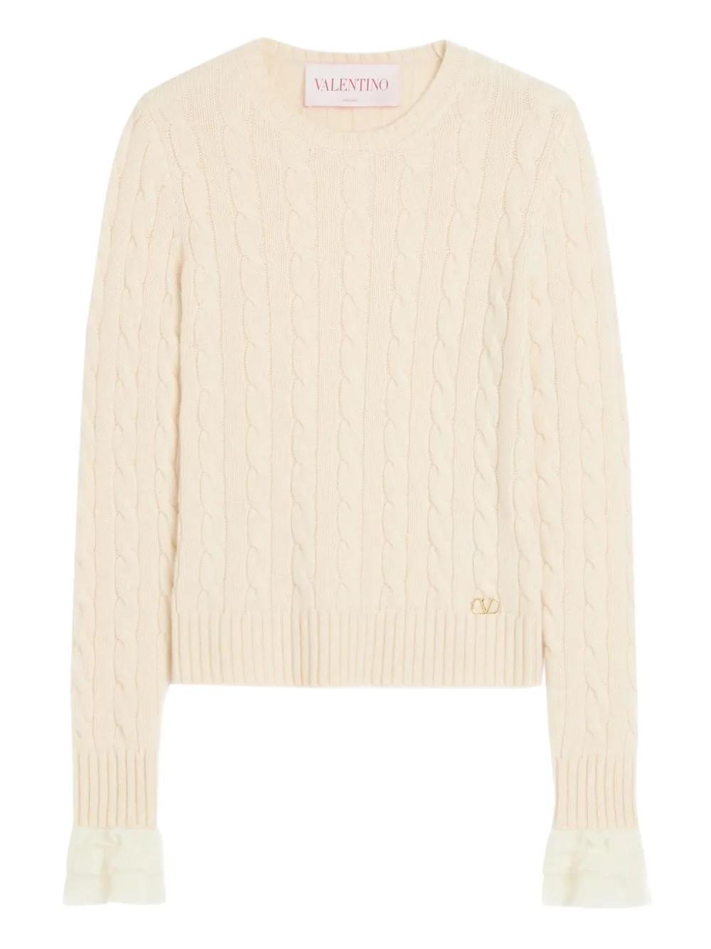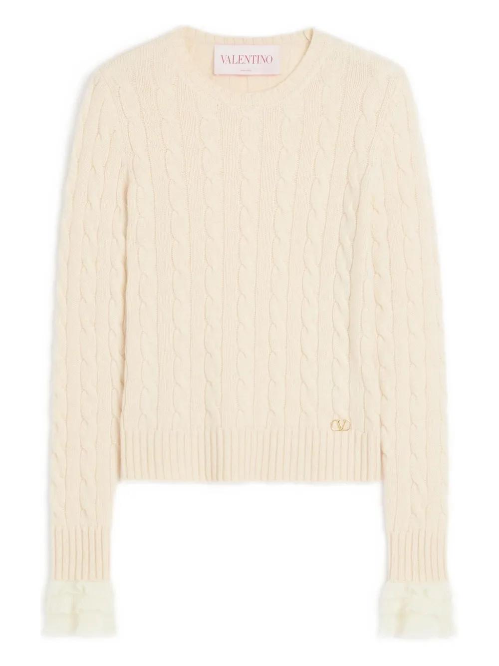 light beige cashmere chunky cable knit ruffled cuffs crew neck ribbed hem VLogo Signature
