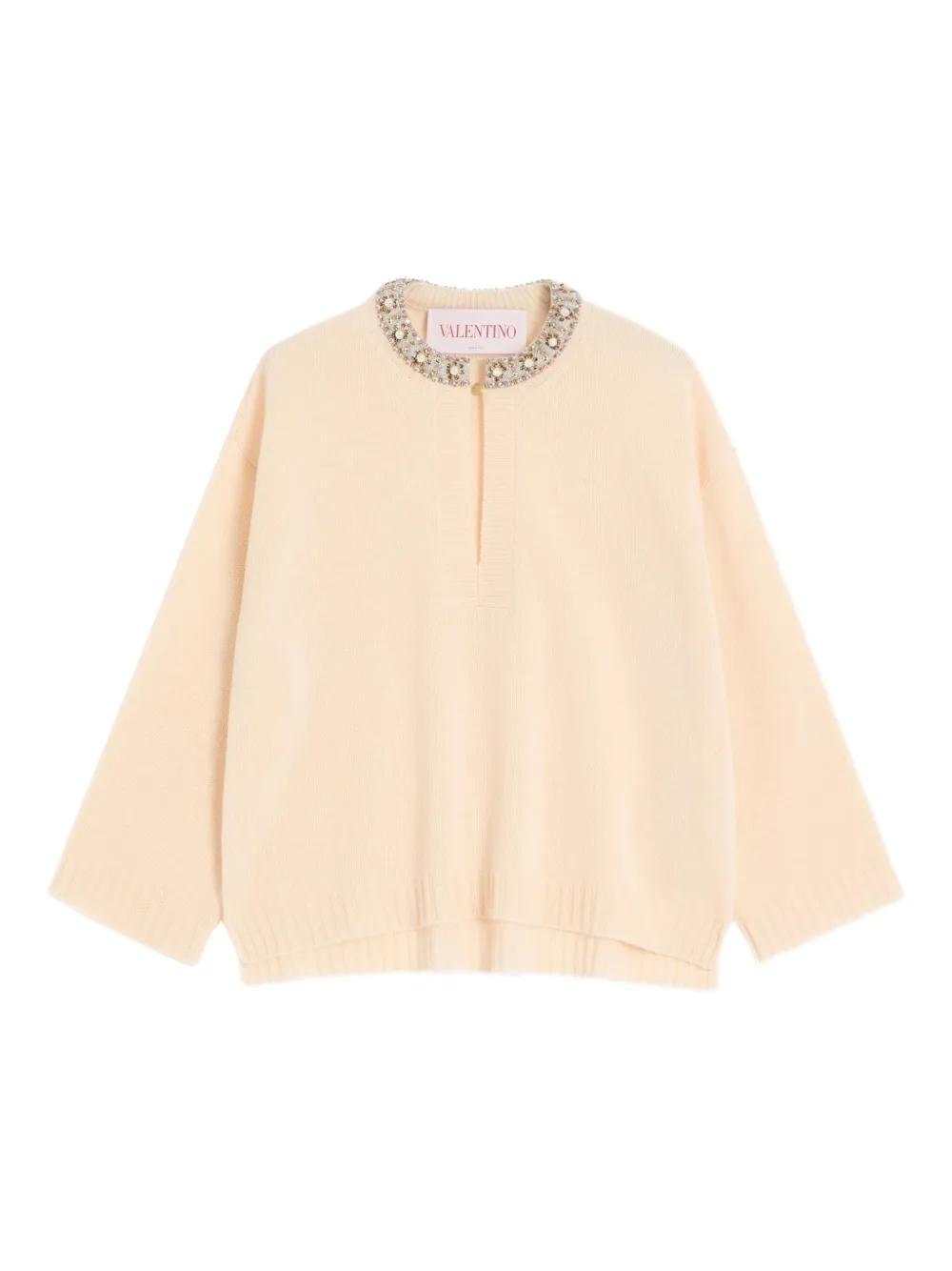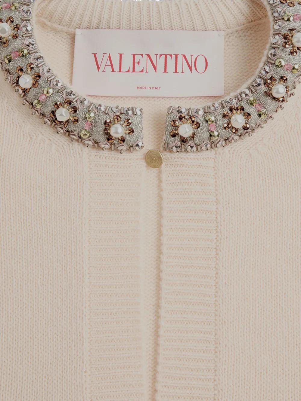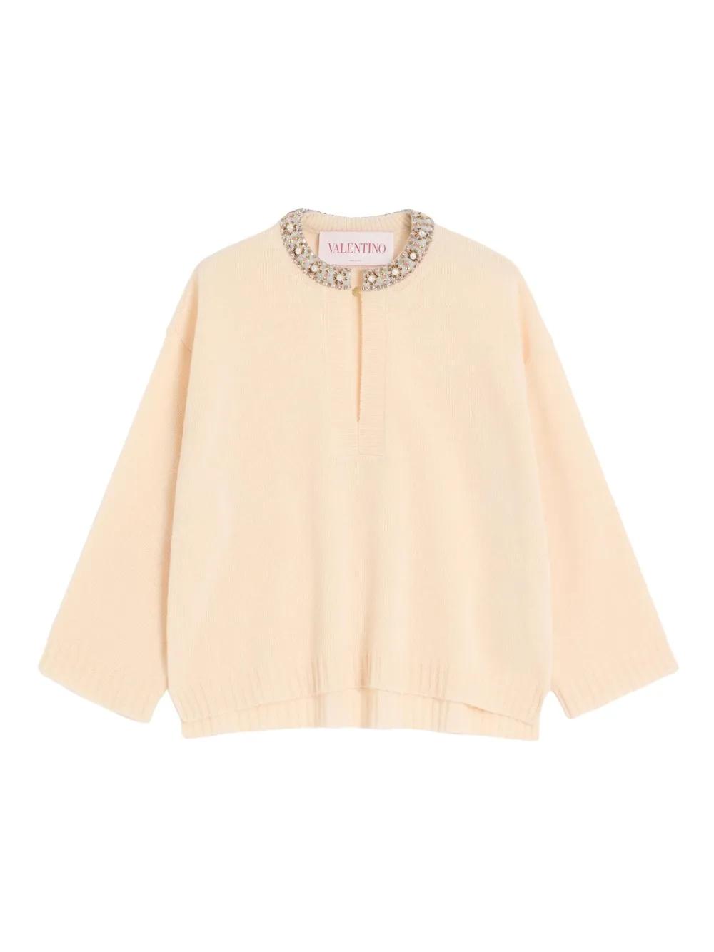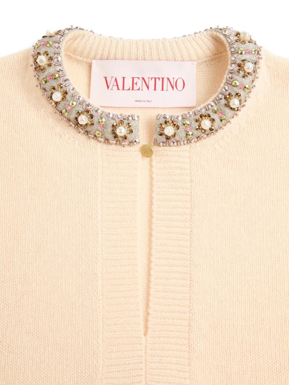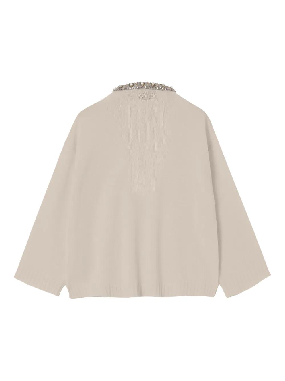 almond beige virgin wool front button fastening embroidery at the neck crew neck long sleeves straight hem