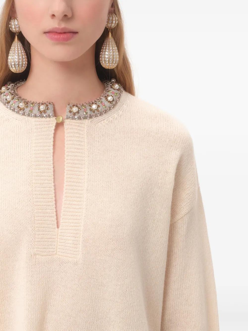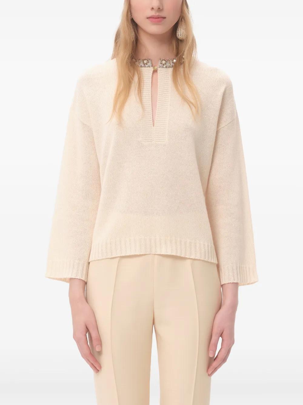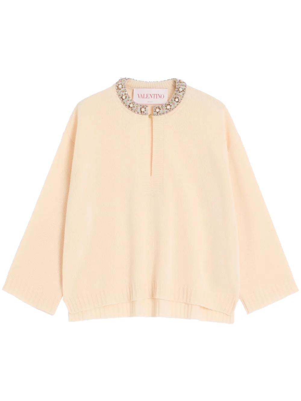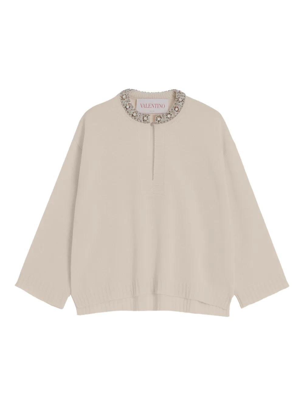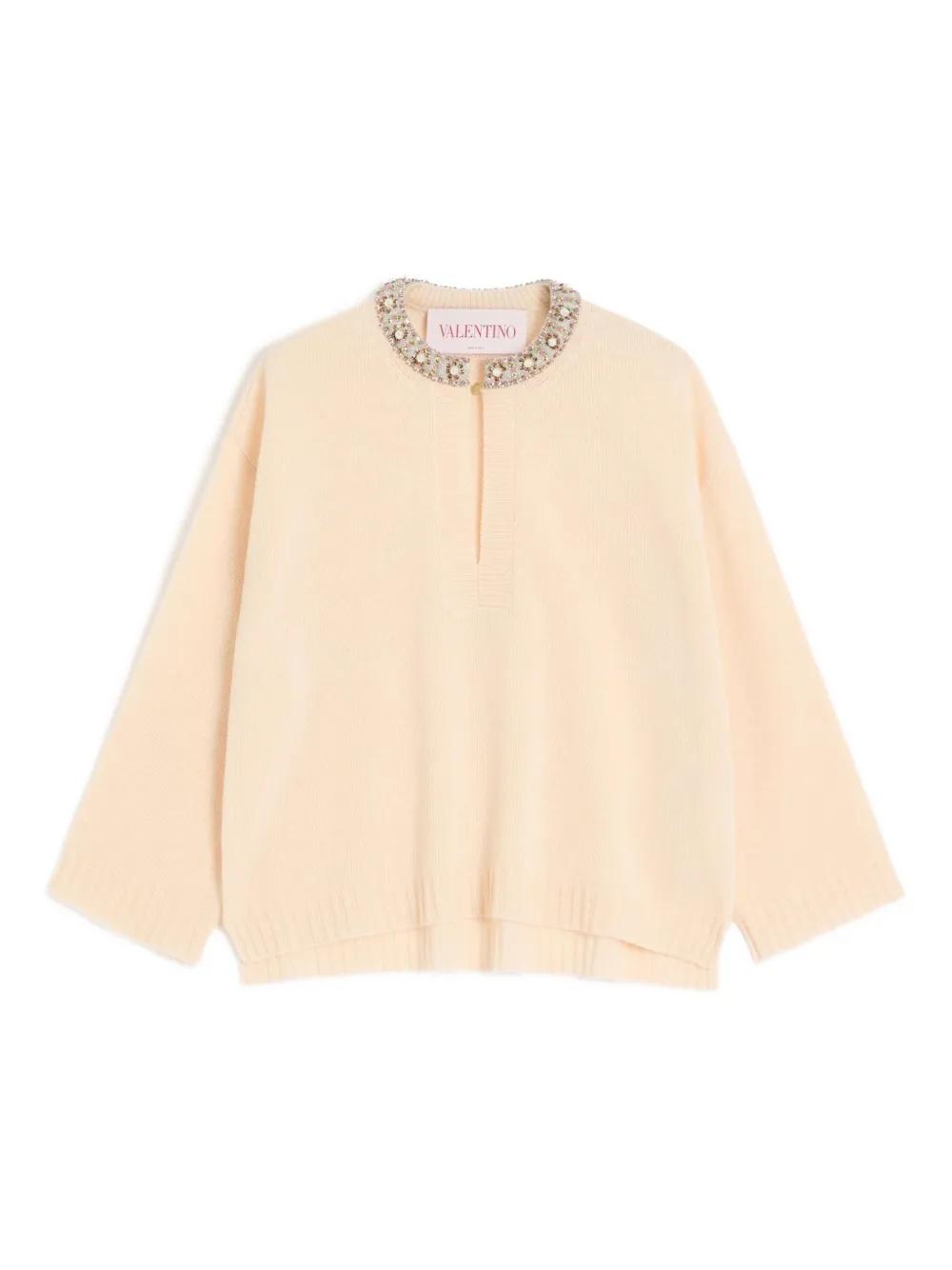 almond beige virgin wool front button fastening embroidery at the neck crew neck long sleeves straight hem