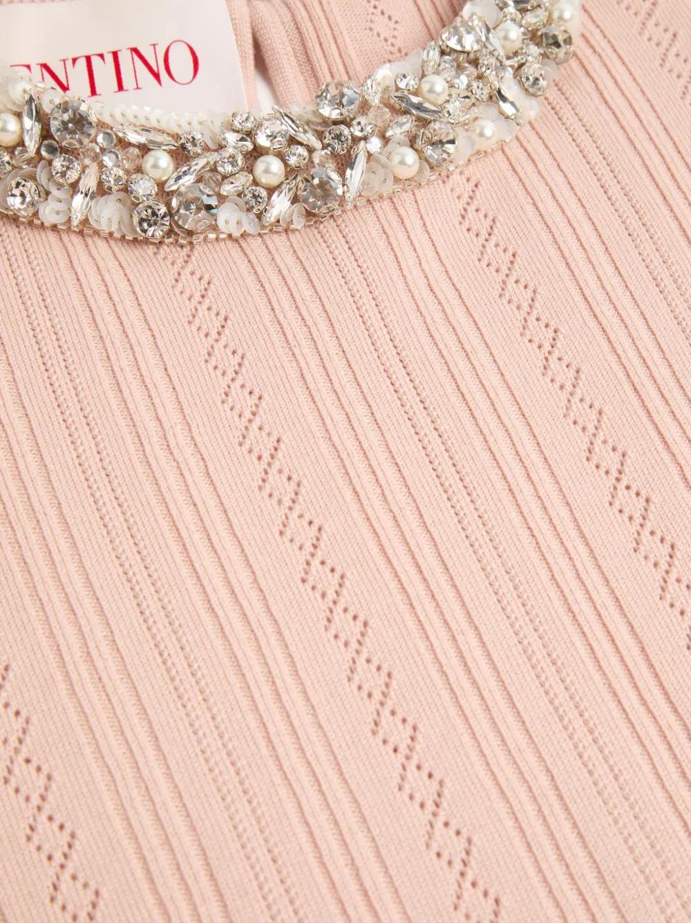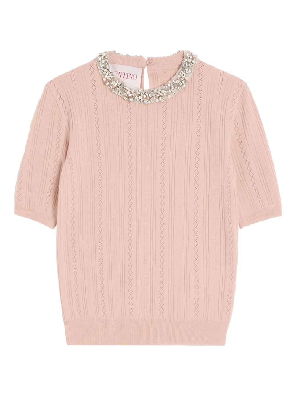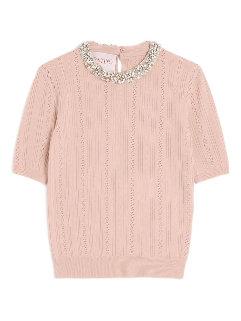 pink virgin wool crystal embellishment at the neck short sleeves rear button fastening
