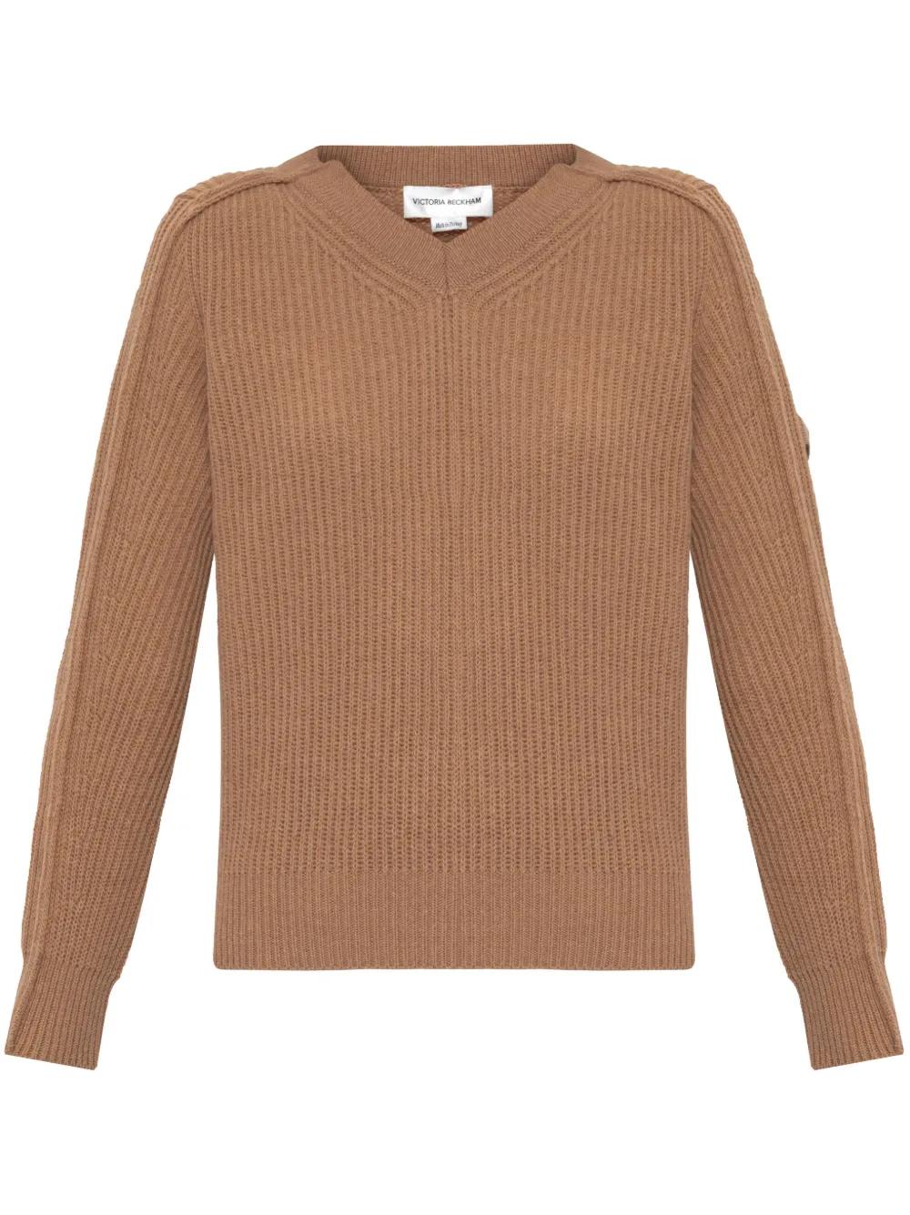 camel brown sleeve patch pocket embroidered logo at the sleeve V-neck