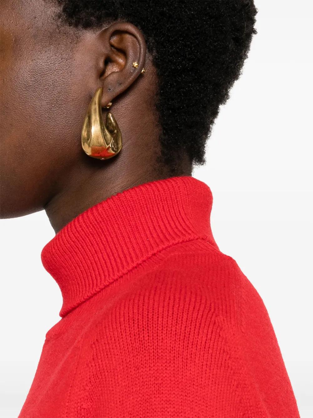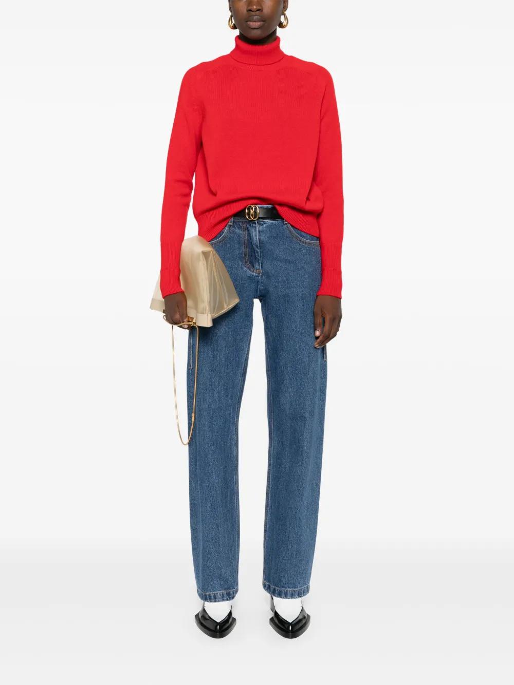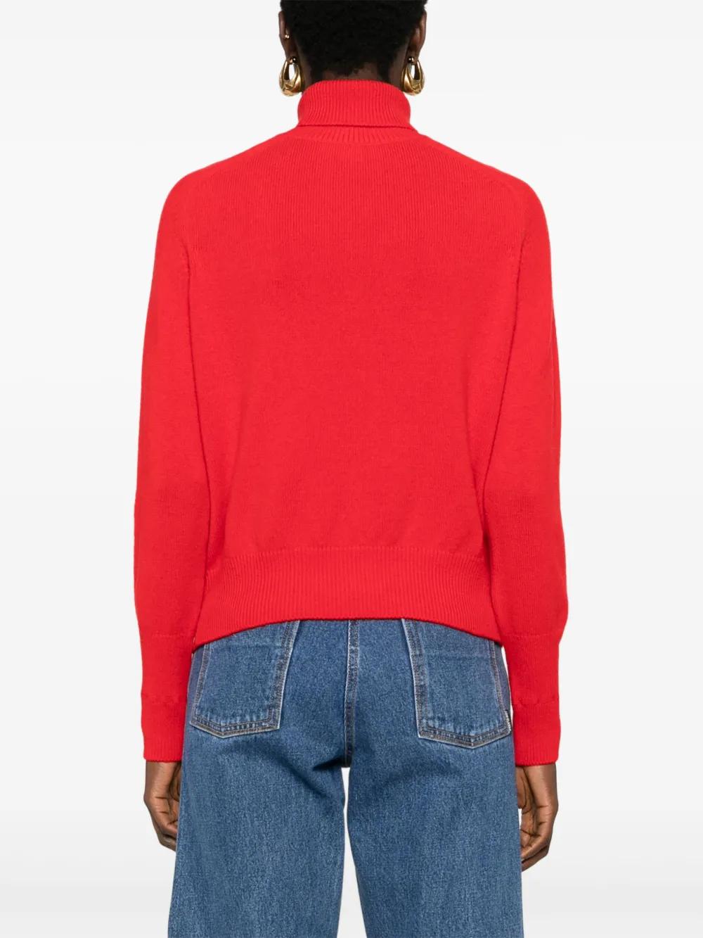 red lambs wool knitted construction ribbed trim roll neck long sleeves straight hem