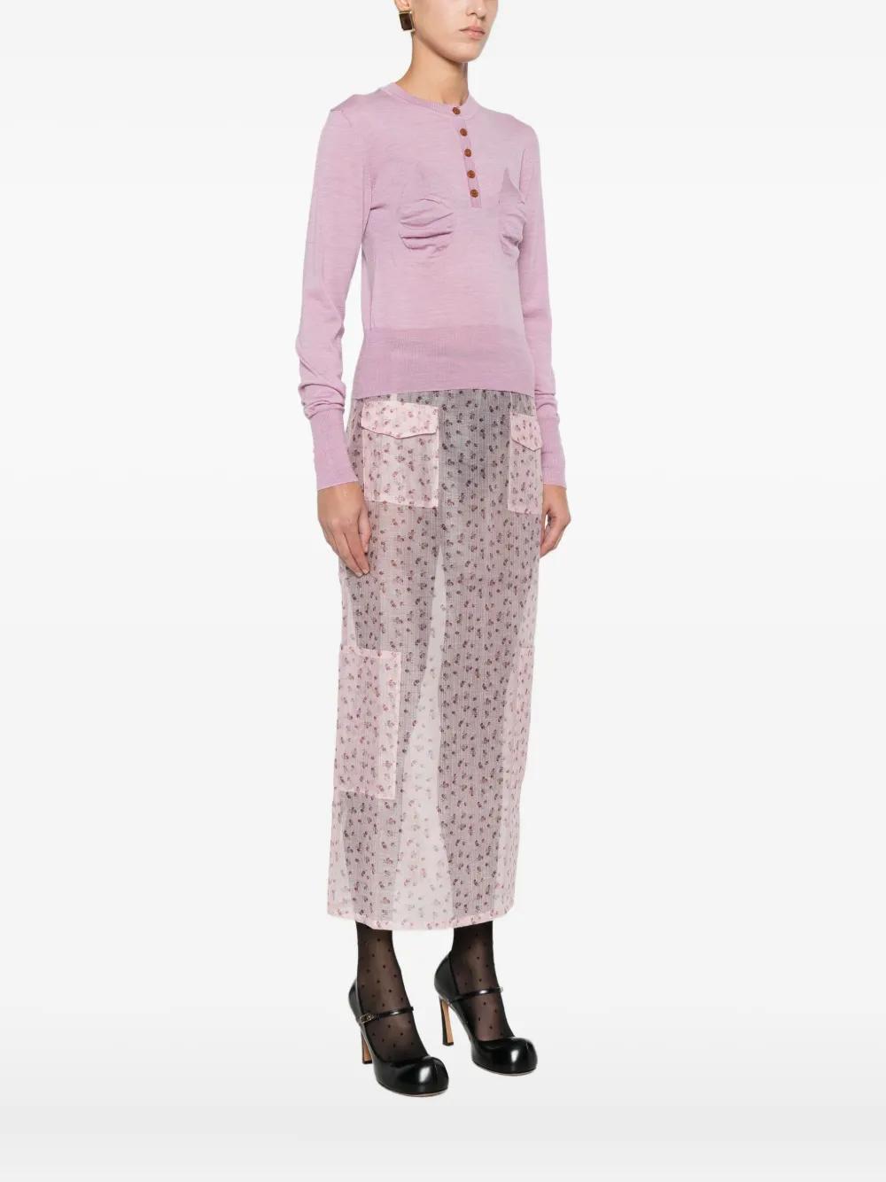 pink front button placket ruched detail round neck long sleeves ribbed cuffs and hem