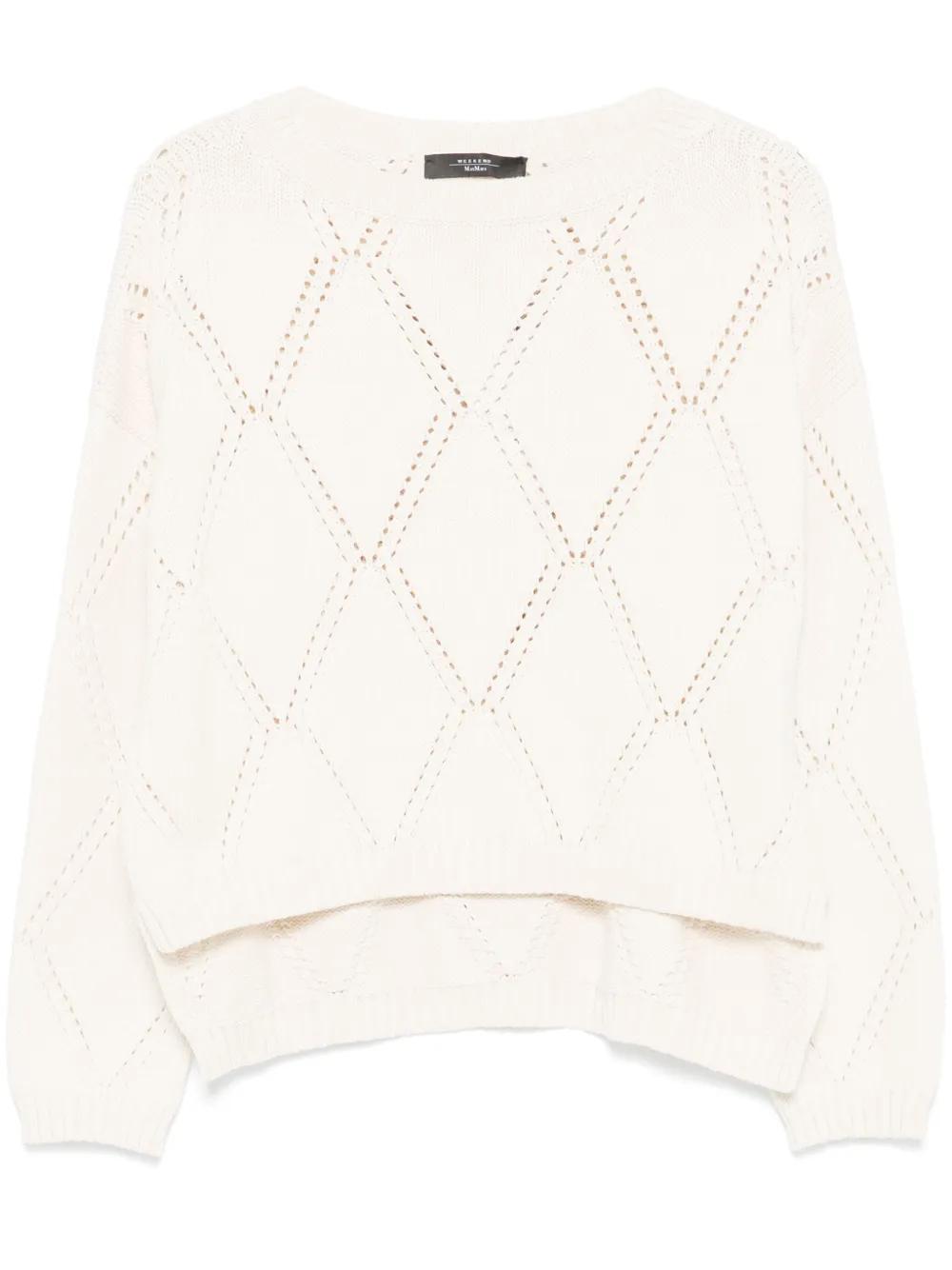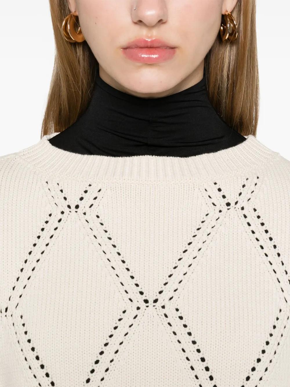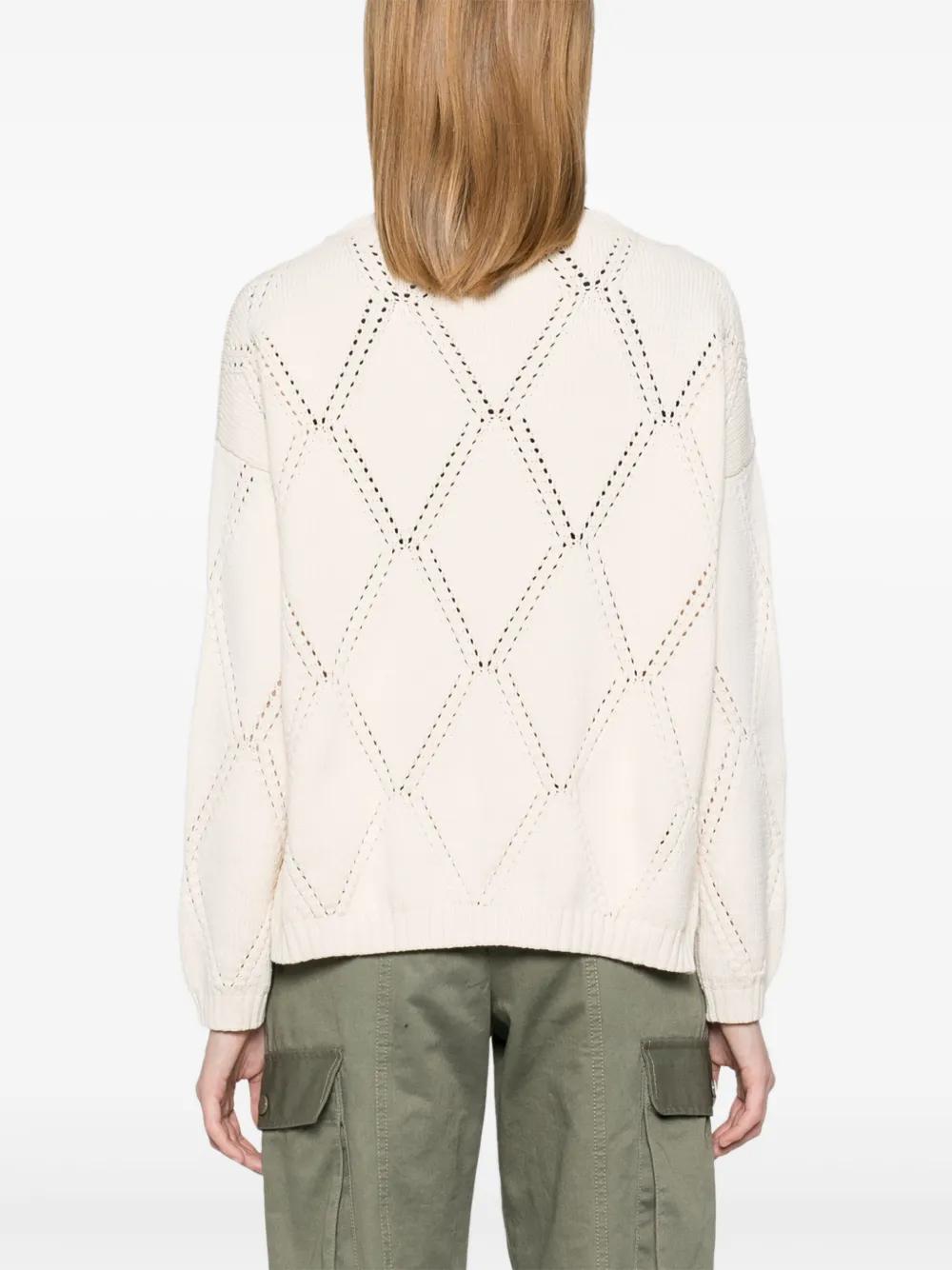 cream white cotton blend knitted construction diamond pattern openwork areas crew neck drop shoulder long sleeves ribbed cuffs and hem
