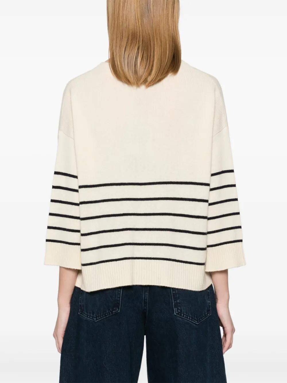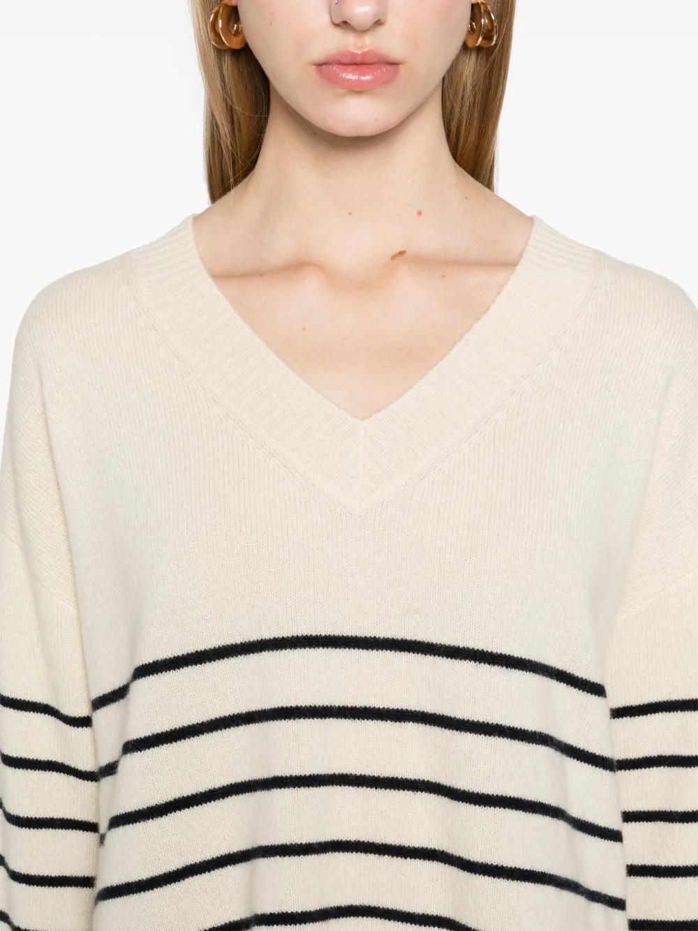 cream white/navy blue cashmere knitted construction horizontal stripe pattern ribbed V-neck drop shoulder three-quarter length sleeves ribbed cuffs and hem