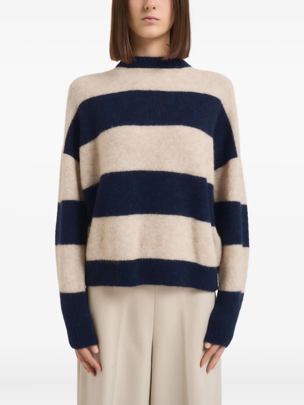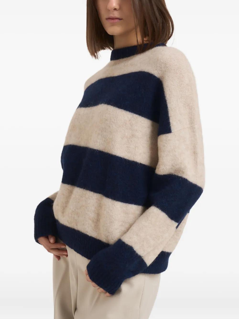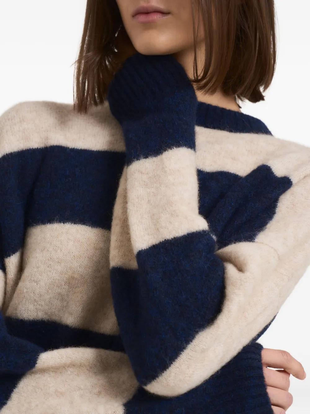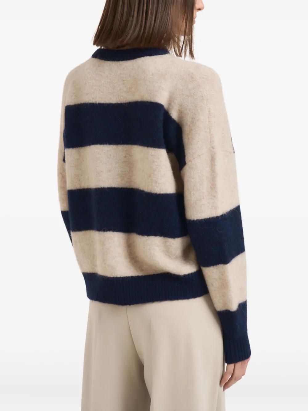 navy blue and beige striped design round neck long sleeves ribbed cuffs ribbed hem