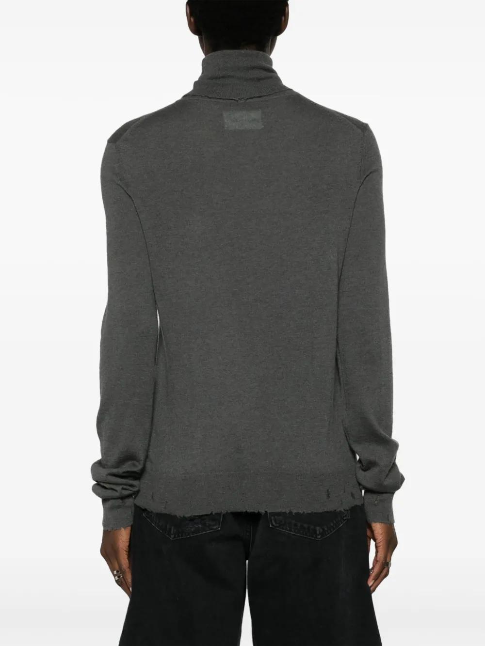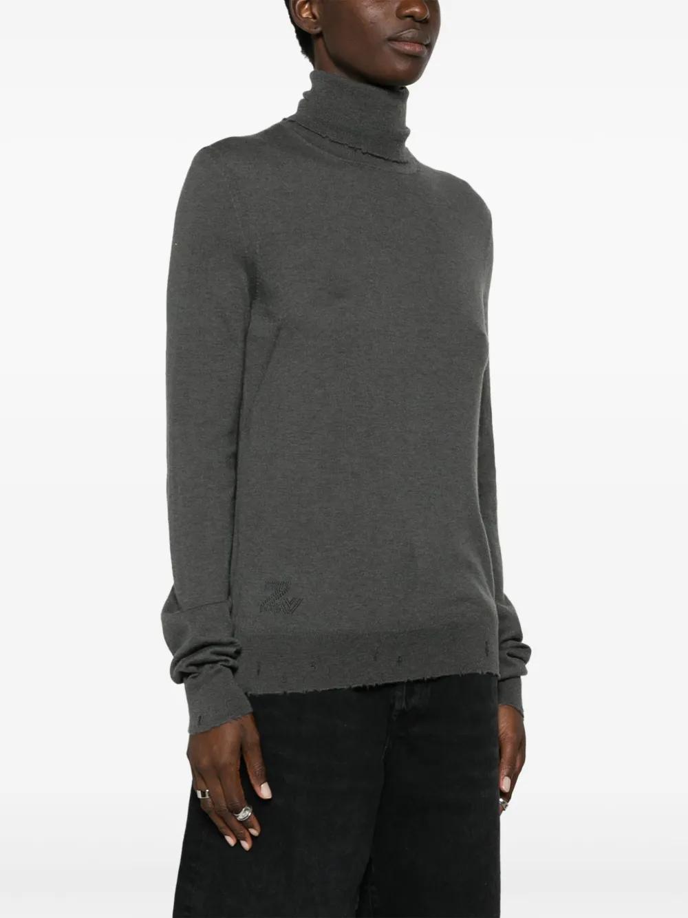 charcoal grey cashmere knitted construction distressed effect roll neck long sleeves straight hem